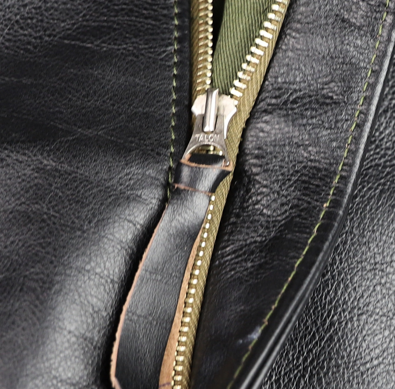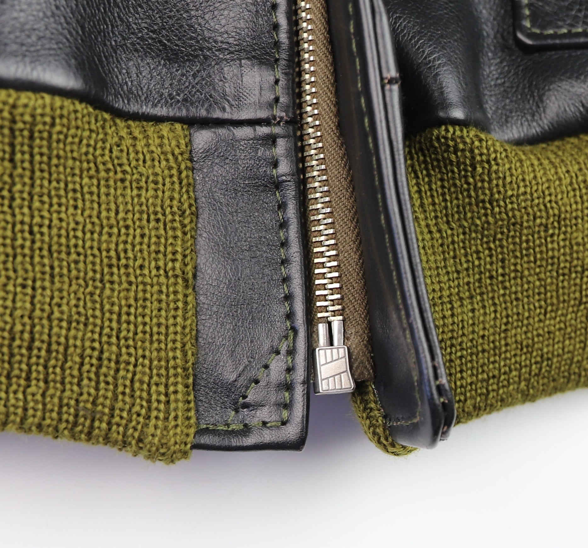 An amazing custom jacket from Thurston Bros. Rough Wear! This is an A-2 Flight Jacket in Blackened Brown Vicenza Italian Full Grain Vegetable Tanned Horsehide, size 46. This A-2 is a 42-15142-P Type A-2 and features a Tan cotton lining, Dark Brown stitching, and Caramel wool knits. Nickel Talon main zipper with Sunburst box.