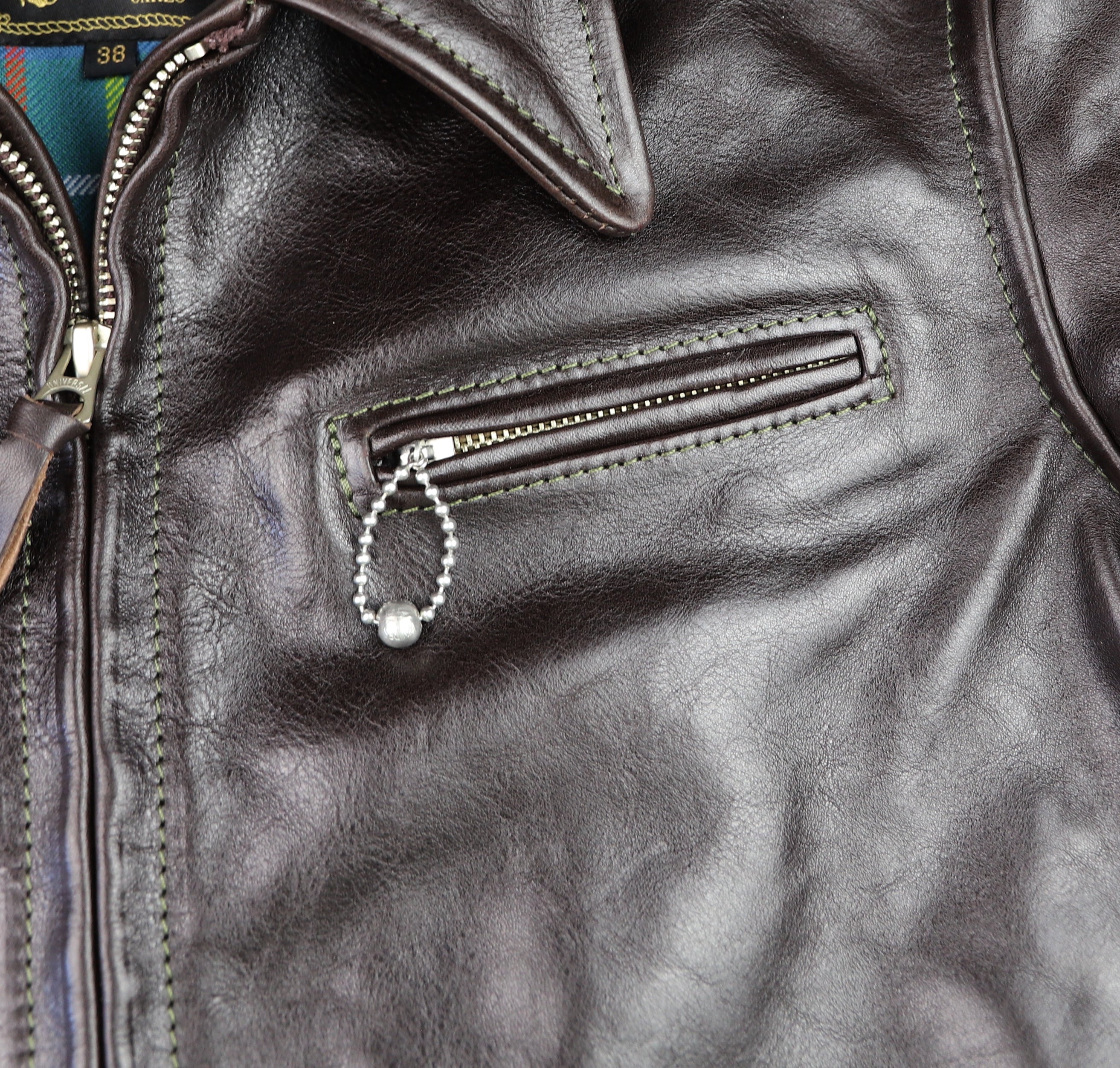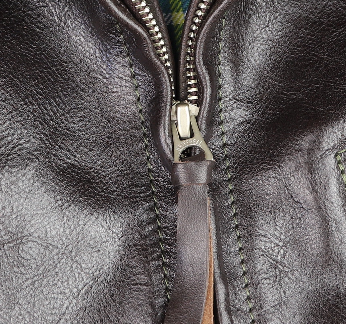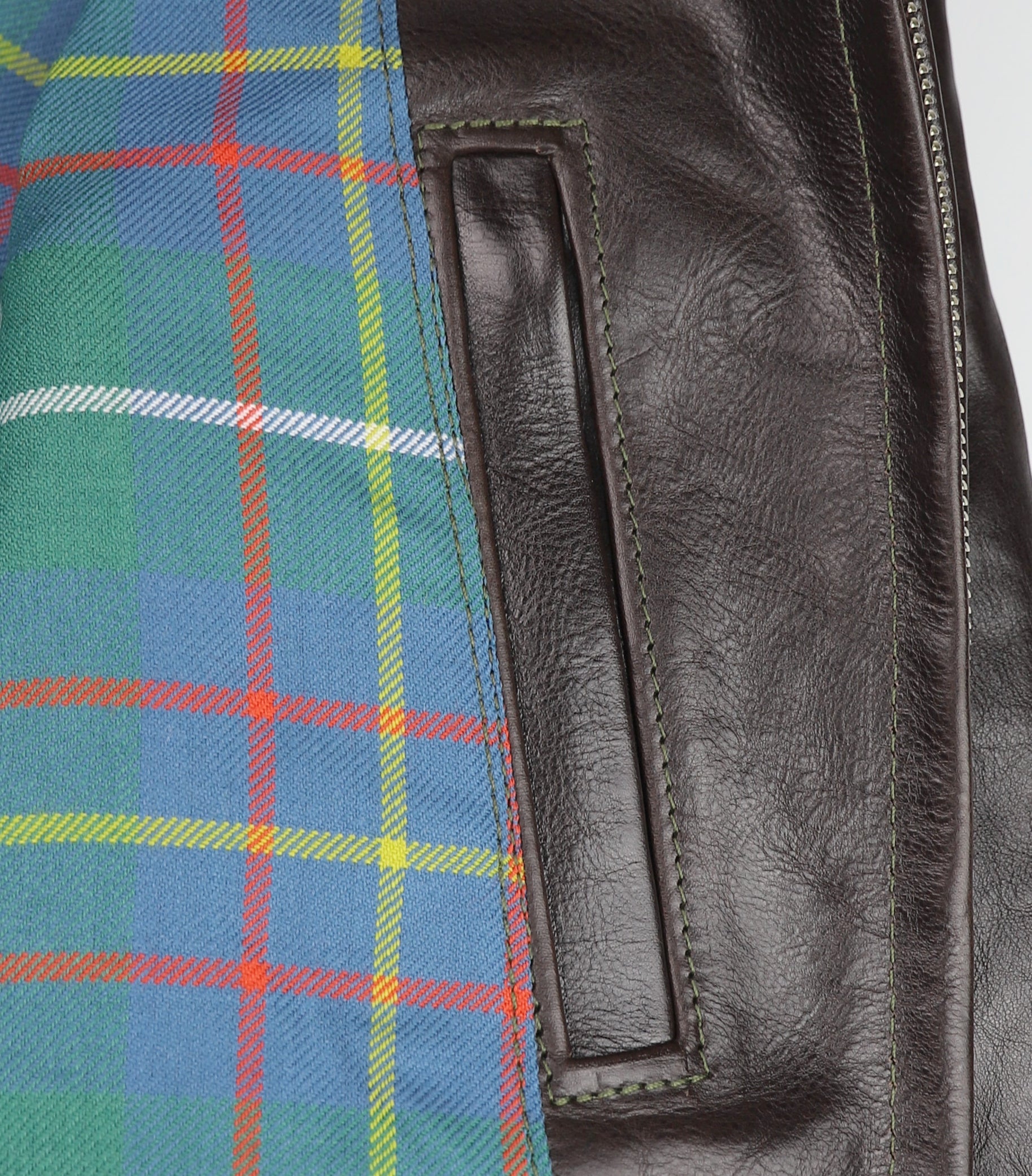 A gorgeous custom jacket from Thurston Bros. Rough Wear! This is an Aero Premier Highwayman in a size 38. It's made with Chestnut Badalassi Italian cowhide, which has a ton of character and grain right out of the box! This jacket features a nickel Universal front zipper, nickel looped ball pull on chest pocket, custom yoke, leather-lined button cuffs, nickel cinches, Olive Drab stitching, Inglis Ancient lightweight wool tartan lining. All pockets are lined with velvety soft, yet super durable moleskin. This jacket has left side interior pocket with no closure.