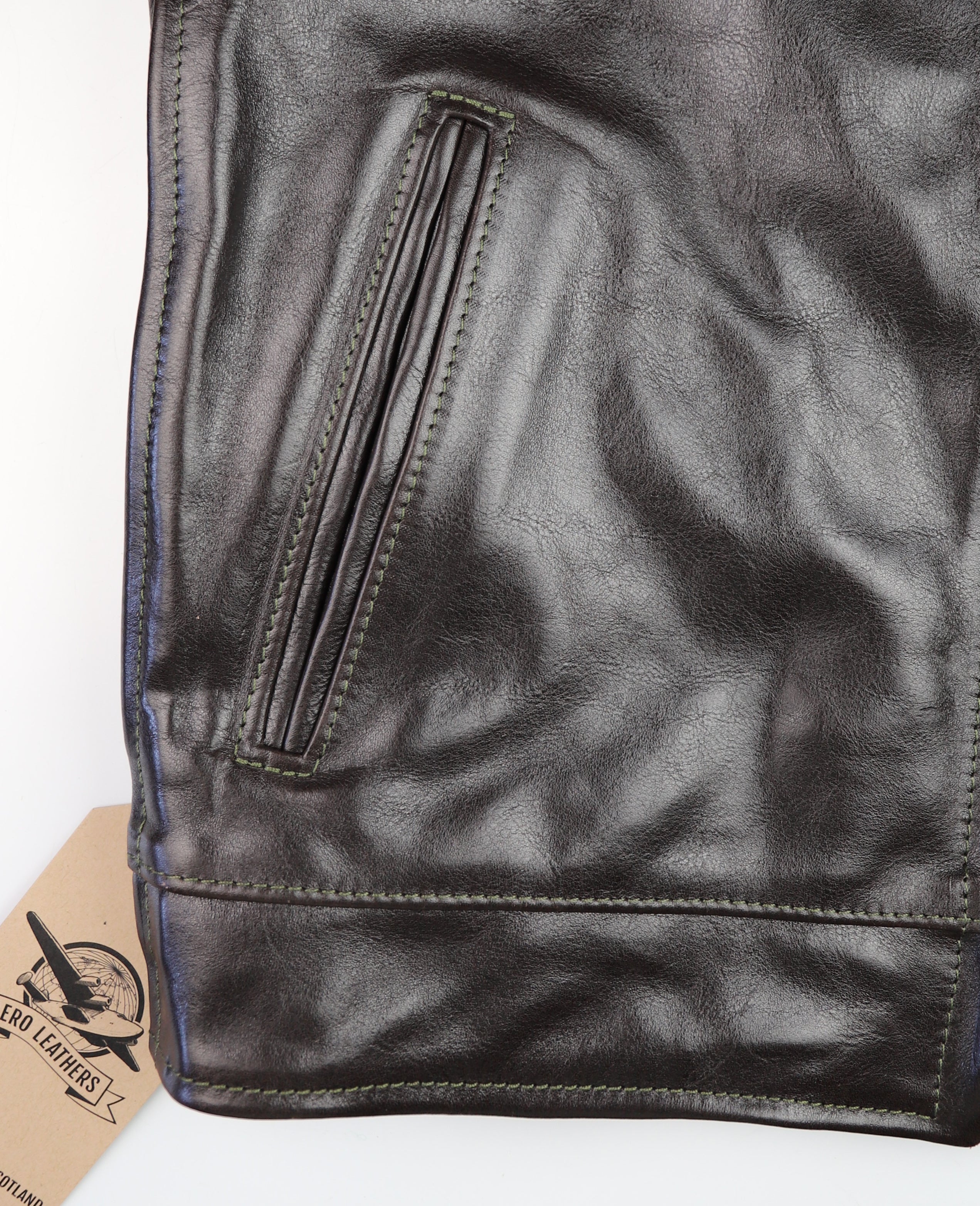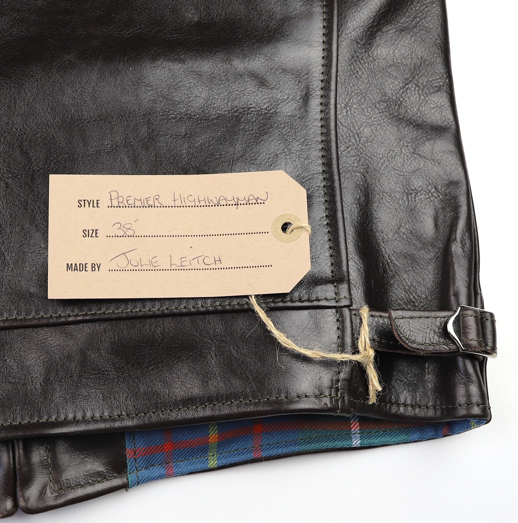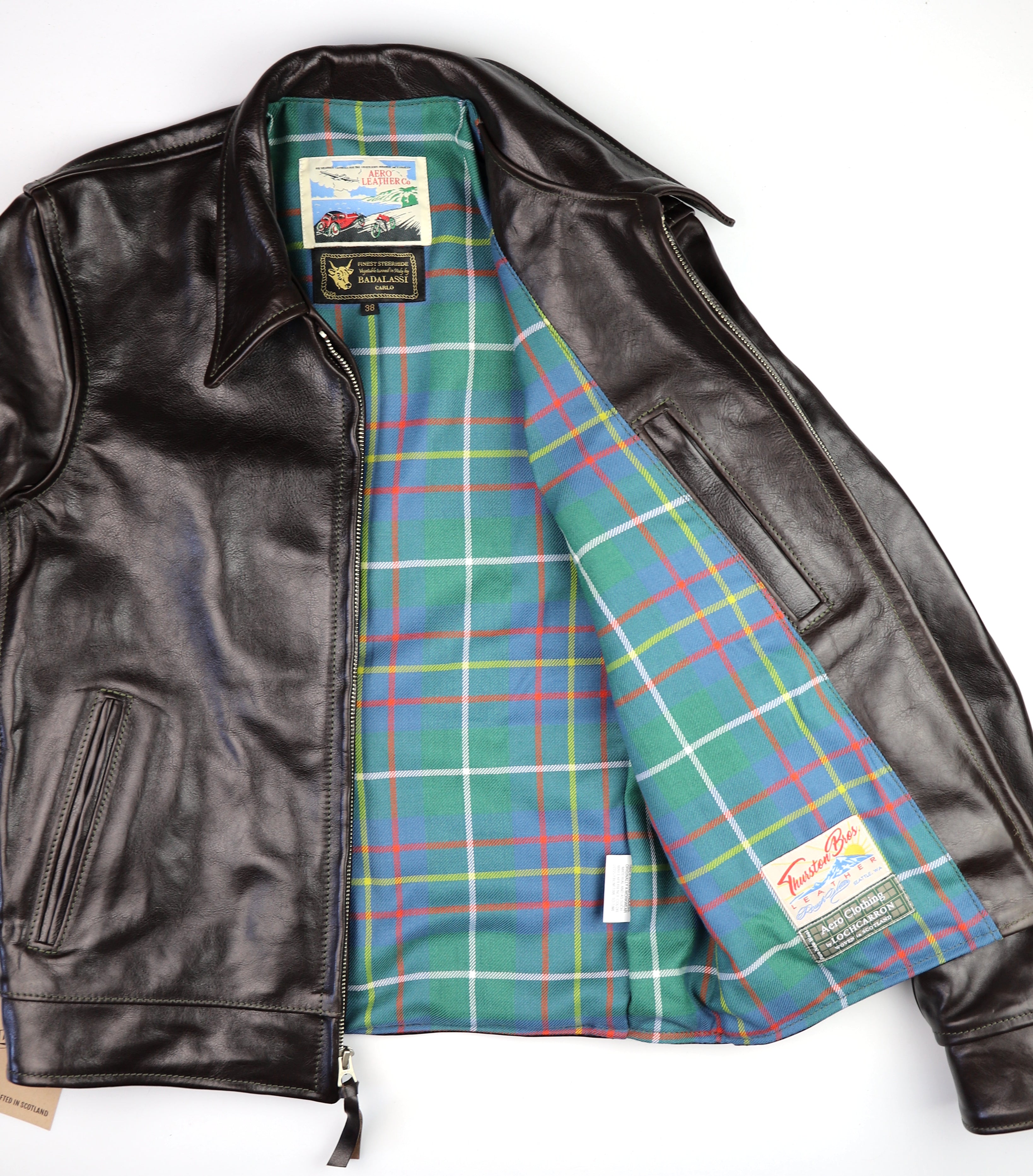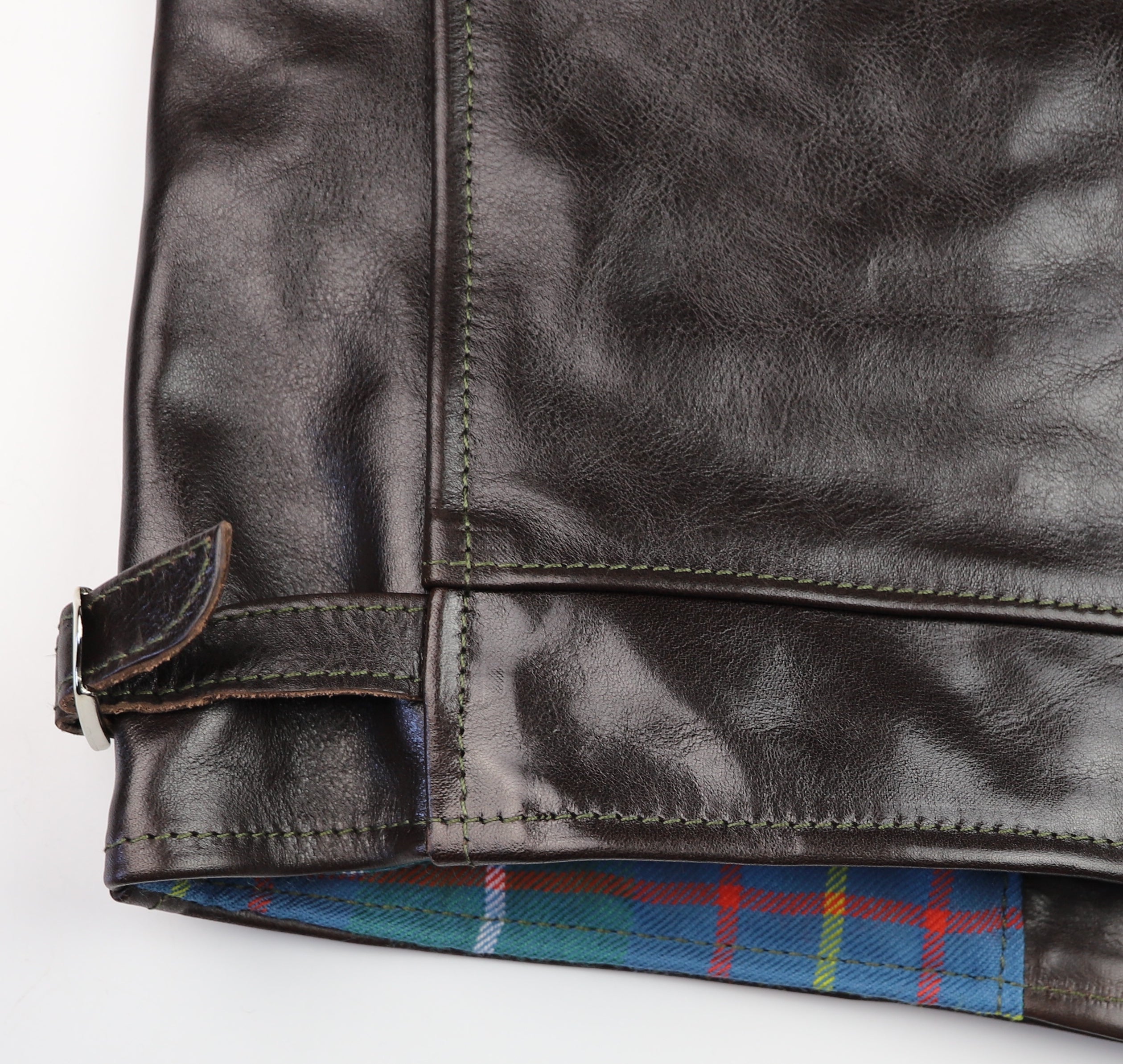 A gorgeous custom jacket from Thurston Bros. Rough Wear! This is an Aero Premier Highwayman in a size 38. It's made with Chestnut Badalassi Italian cowhide, which has a ton of character and grain right out of the box! This jacket features a nickel Universal front zipper, nickel looped ball pull on chest pocket, custom yoke, leather-lined button cuffs, nickel cinches, Olive Drab stitching, Inglis Ancient lightweight wool tartan lining. All pockets are lined with velvety soft, yet super durable moleskin. This jacket has left side interior pocket with no closure.