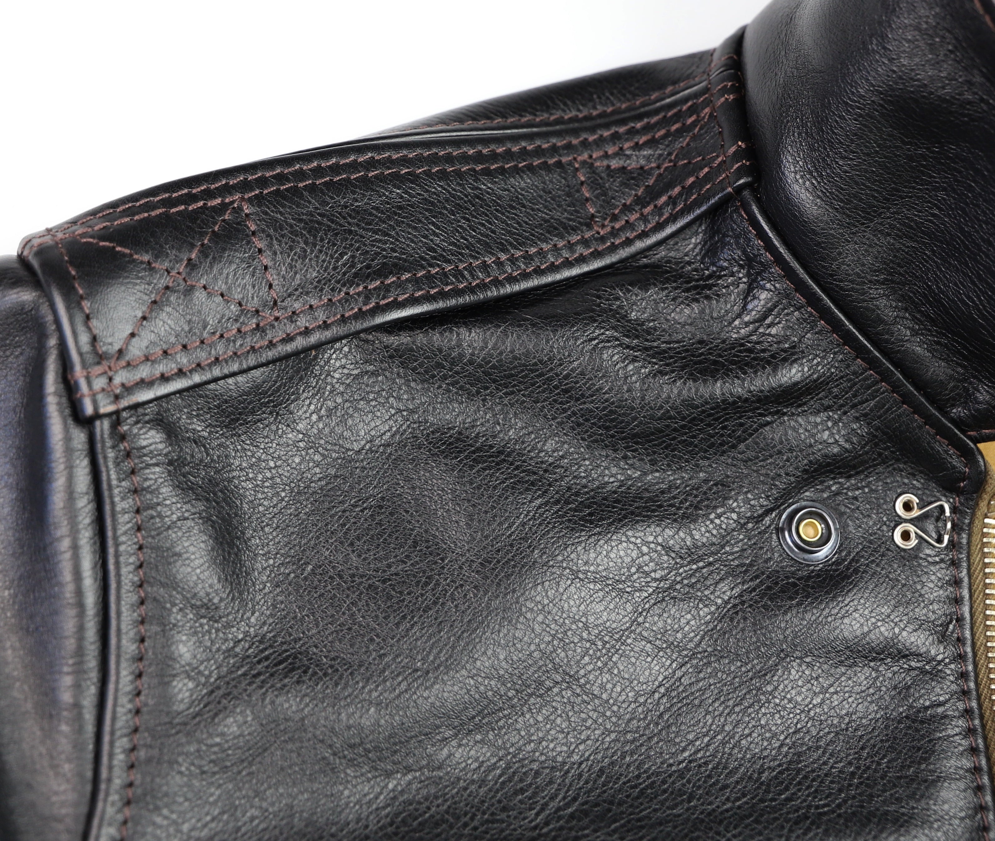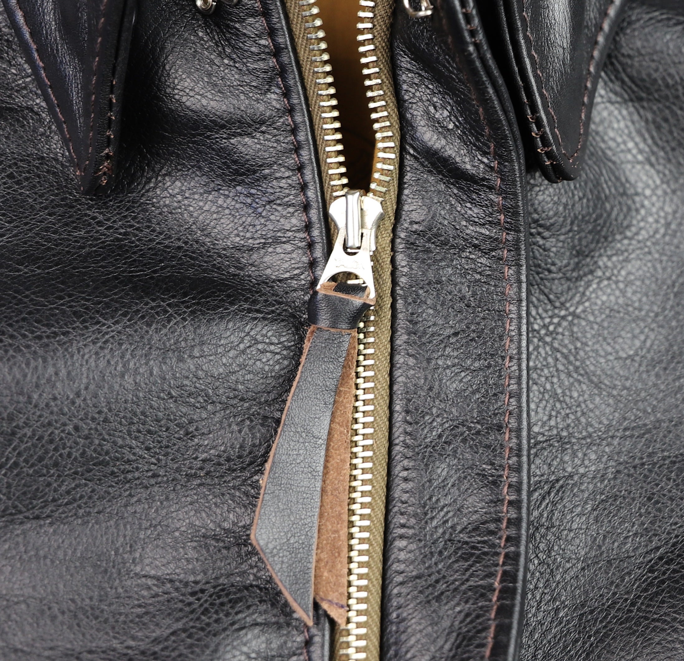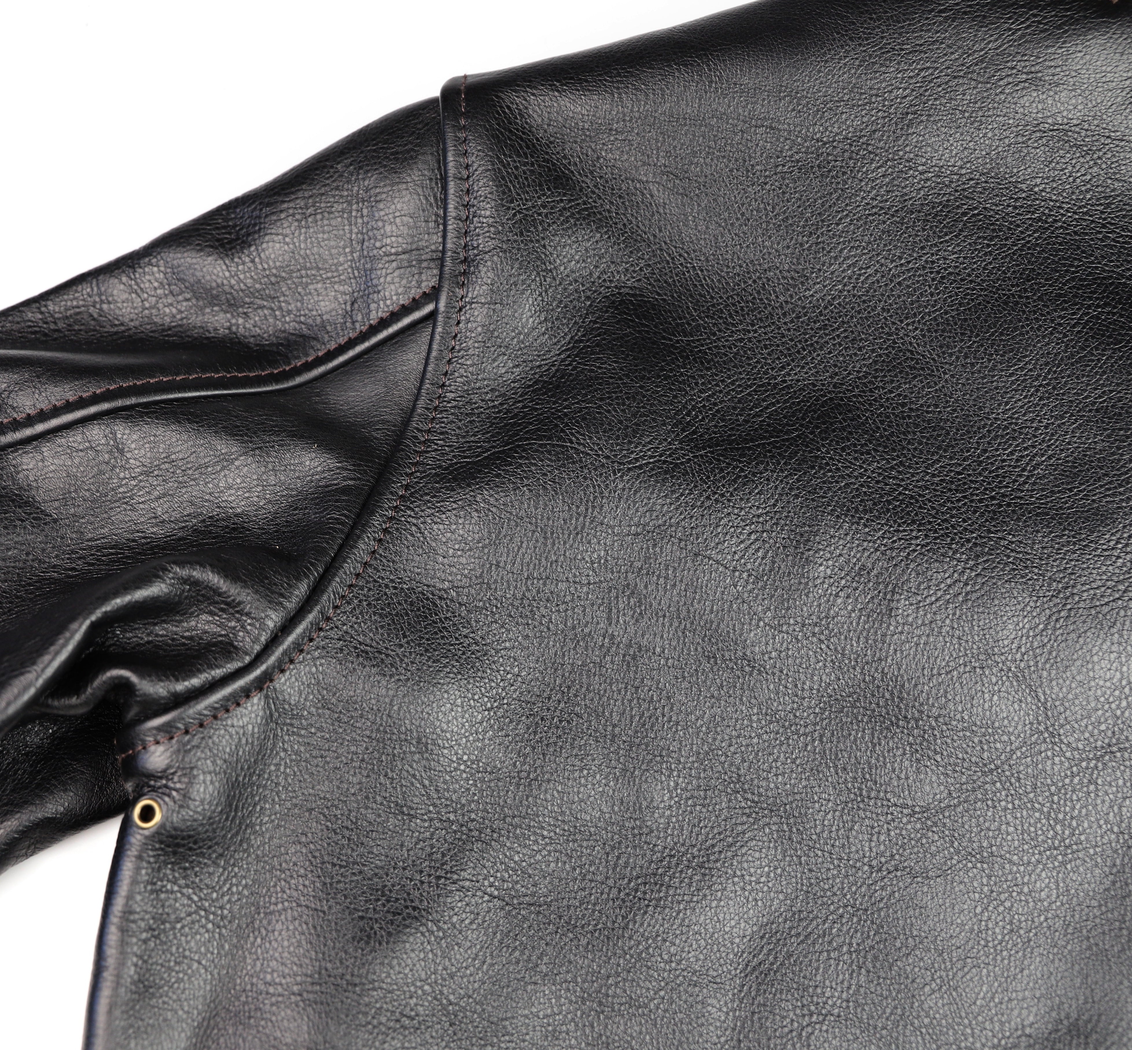 This Vicenza Italian veg-tanned full-grain horsehide has lots of grain and character--photos show these great details!  The Blackened Brown Vicenza is a unique color combination--it is a Dark Seal Vicenza HH with a Black overdye.  The initial result is a warm black color that will develop dark brown wear as the jacket breaks in over years of weathering!  The Vicenza Horsehide is an upgrade on the A-2 style.