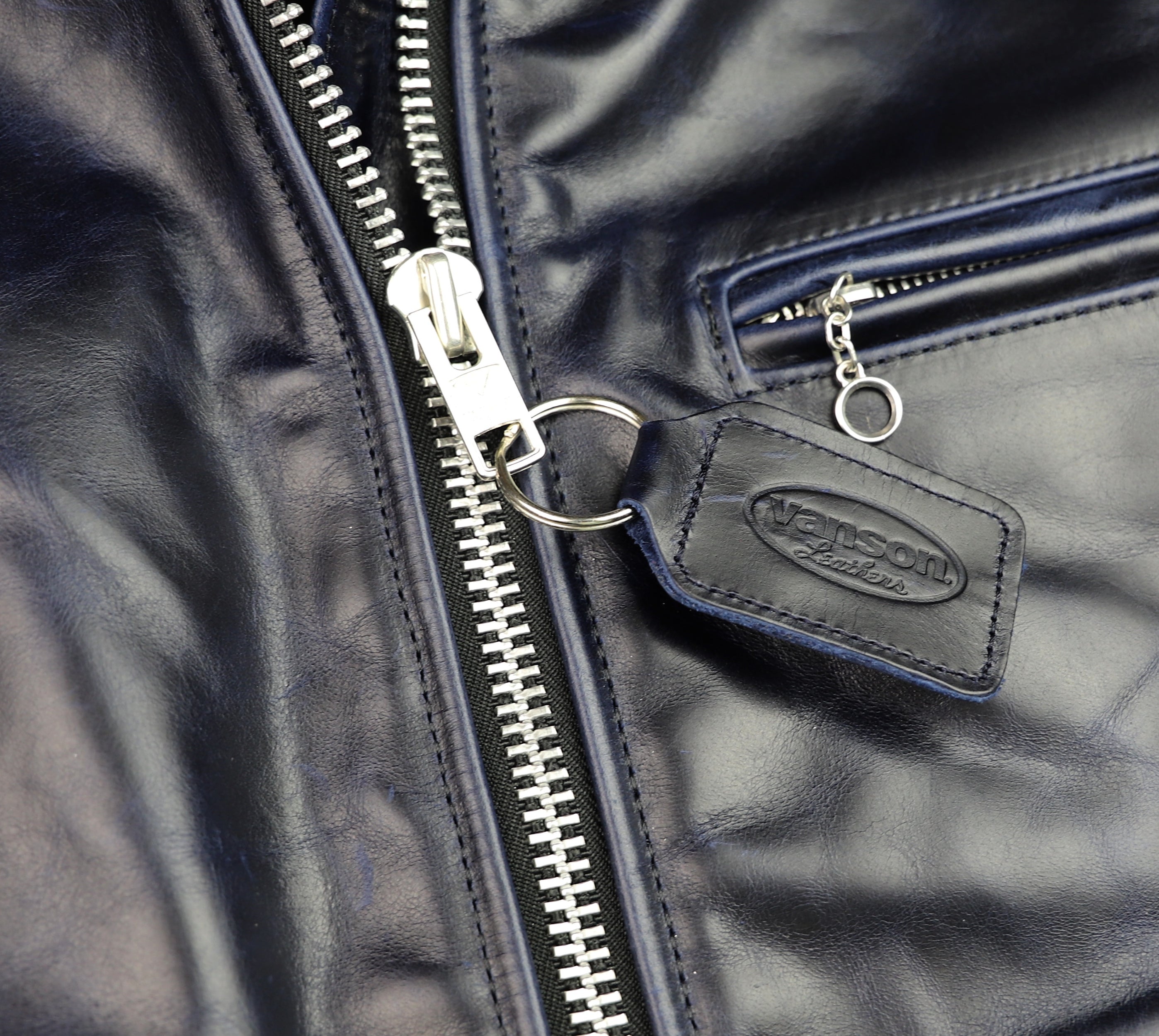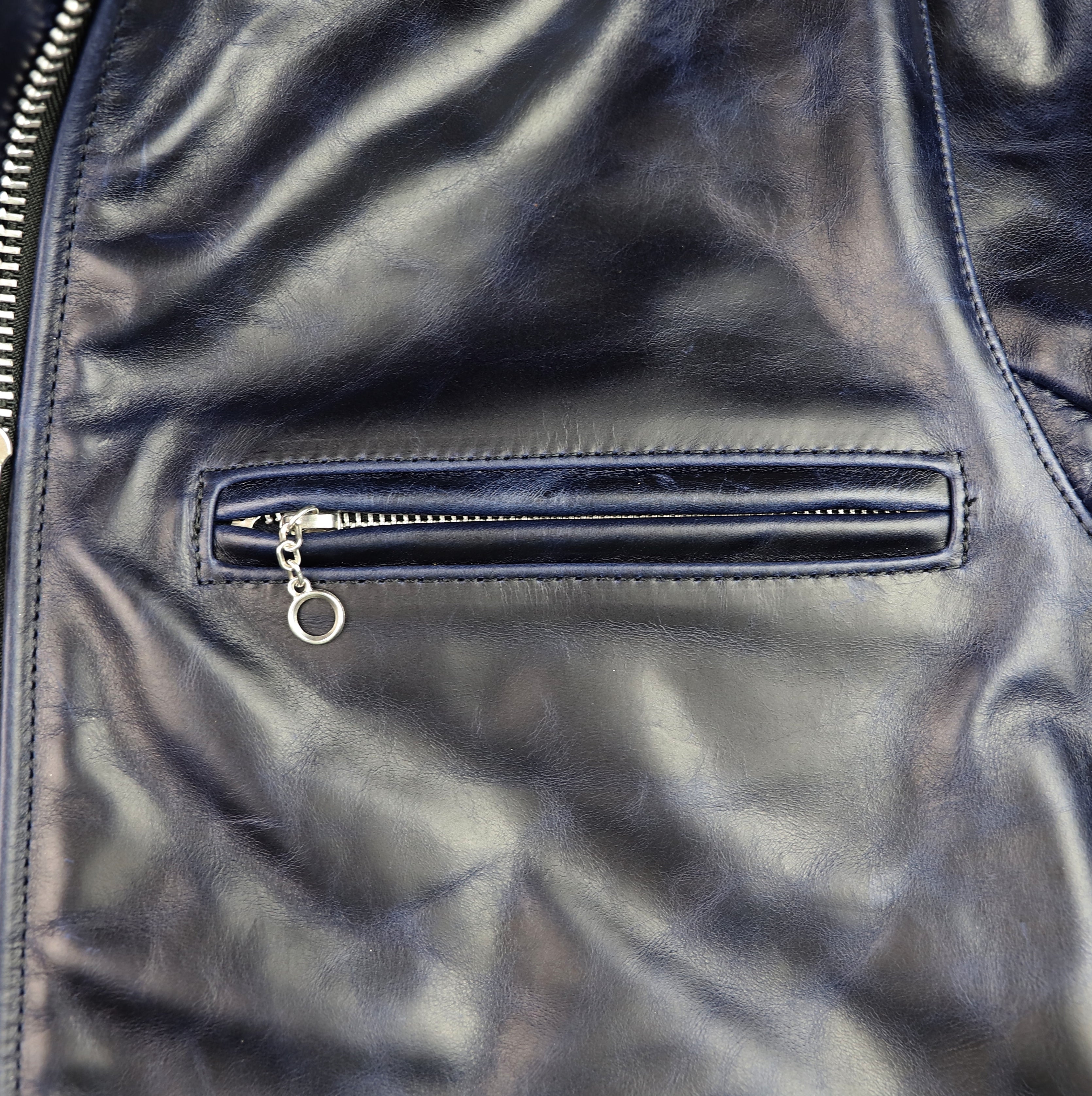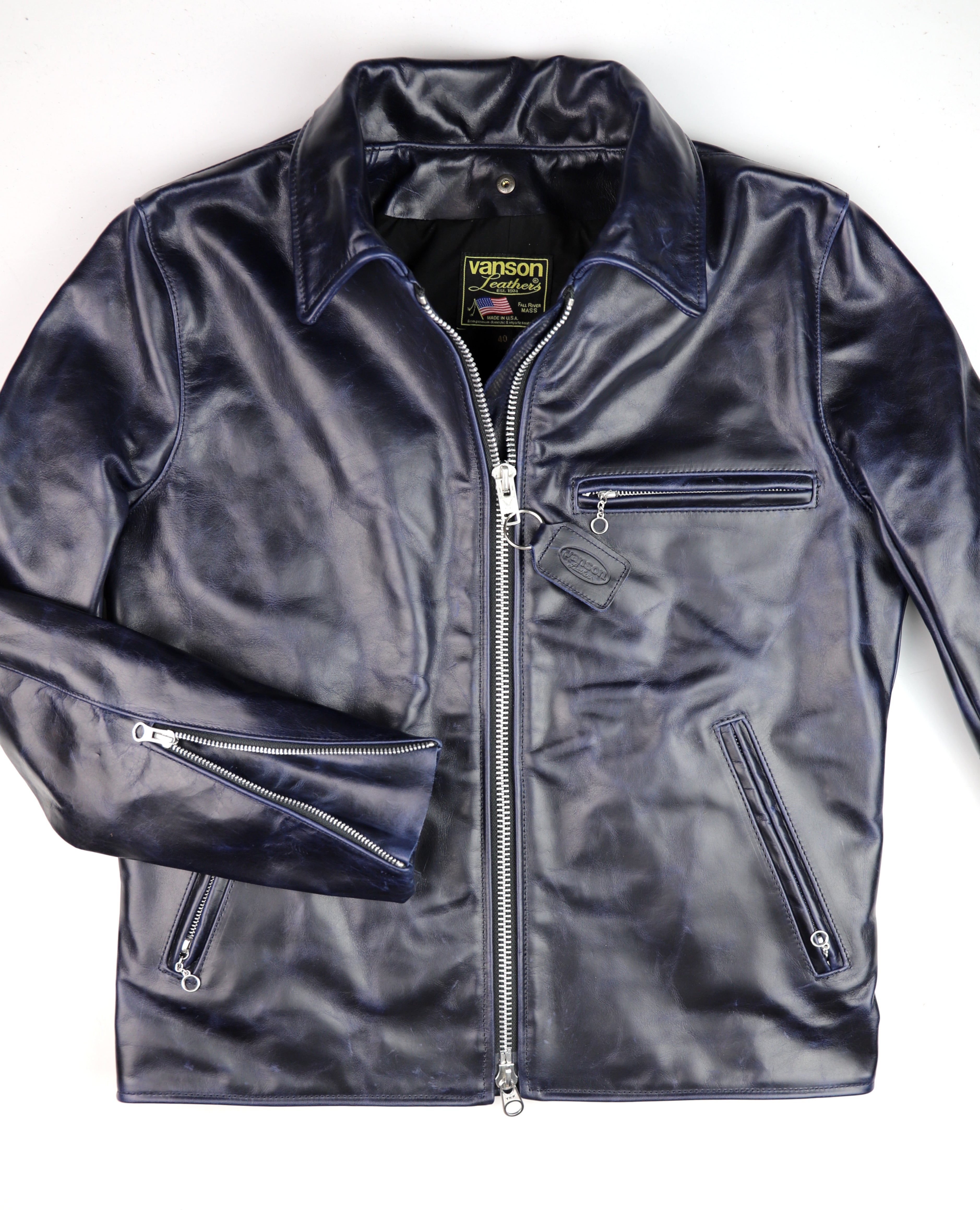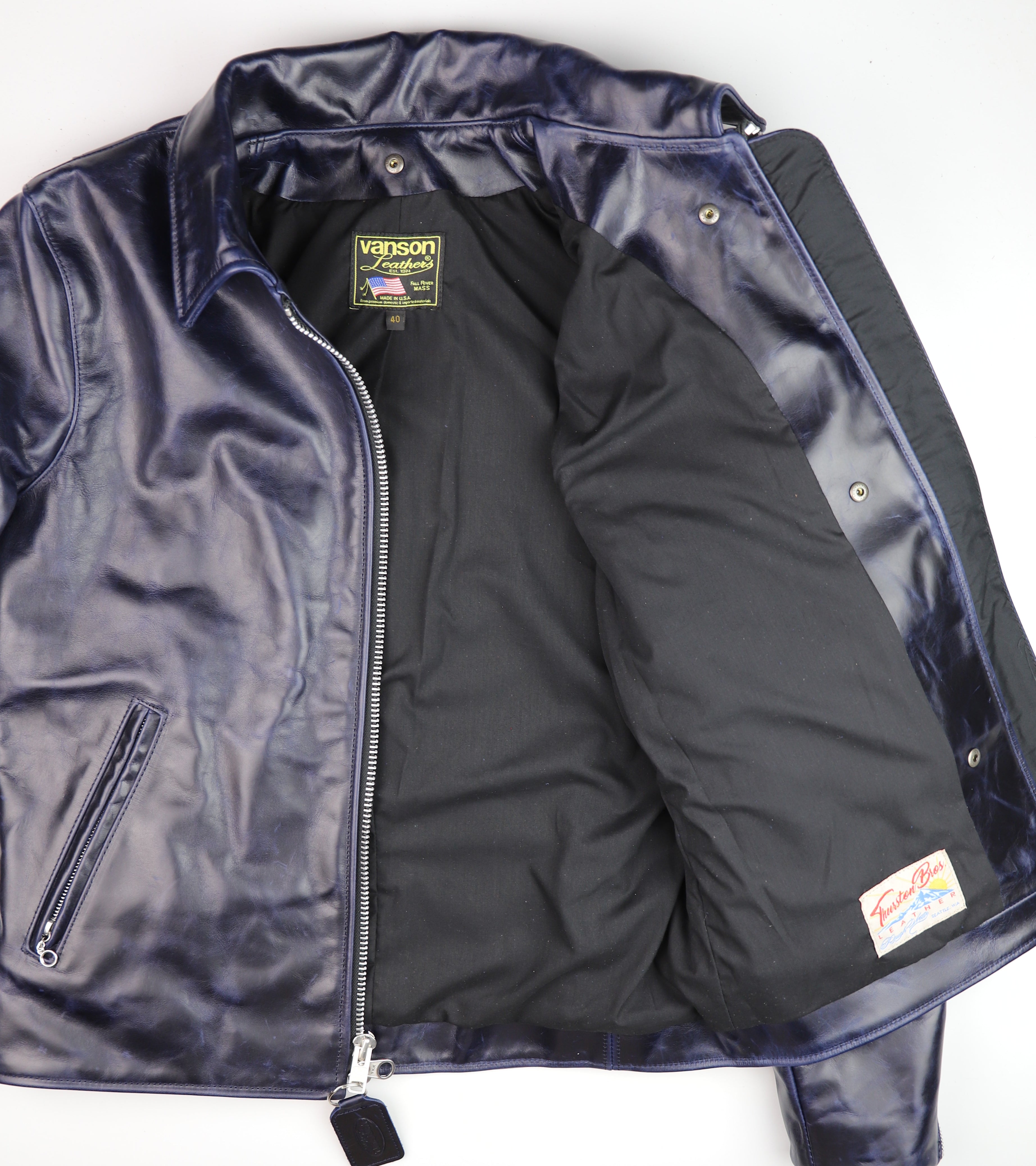Thurston x Vanson Oxford Jacket! This Slimfit Oxford is customized for our shop--this jacket is made with Abyss Blue Bainbridge cowhide and nickel hardware. It has a lightweight black rayon lining, shoulder gussets, adjustable side straps, and a right side interior pocket.