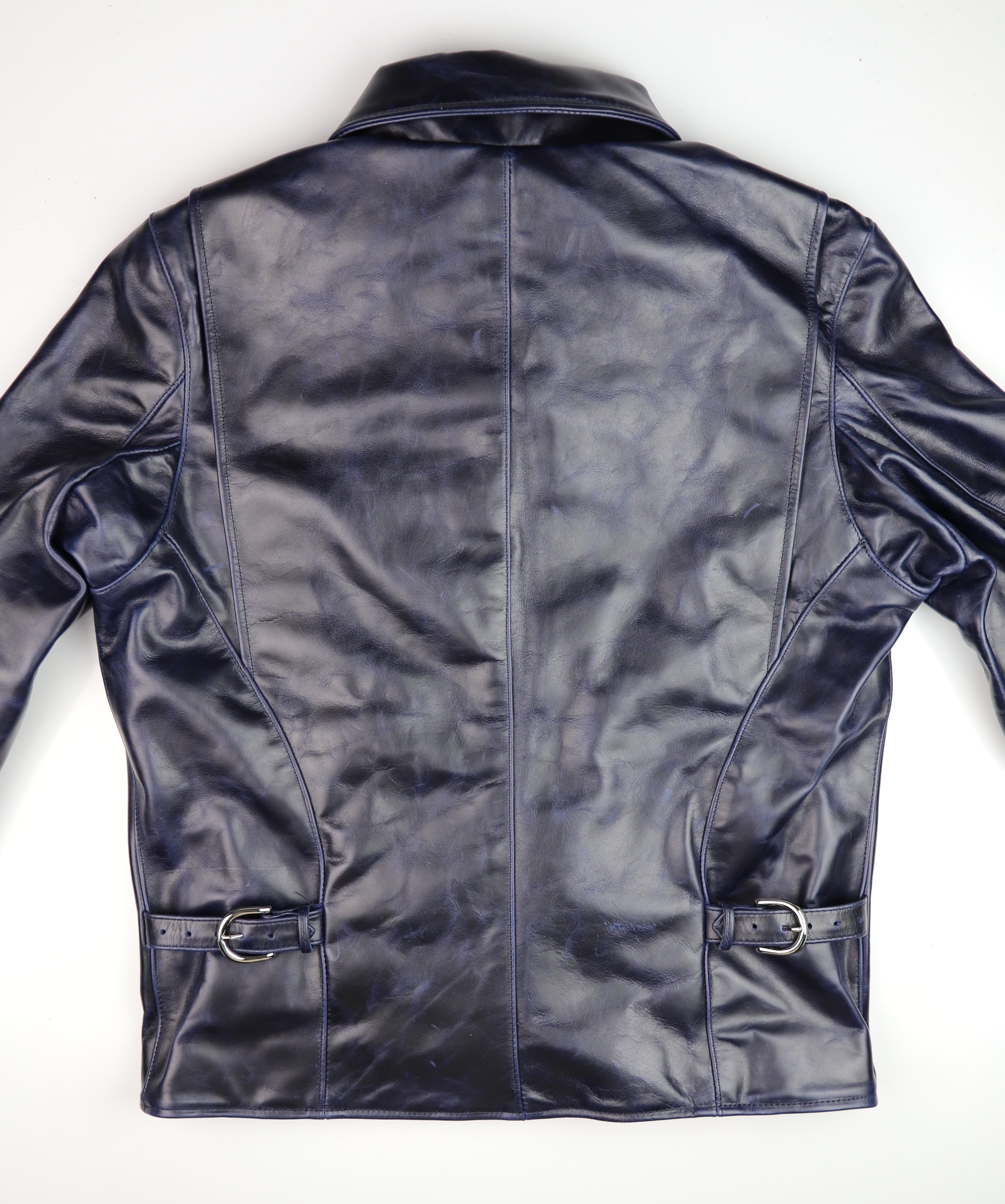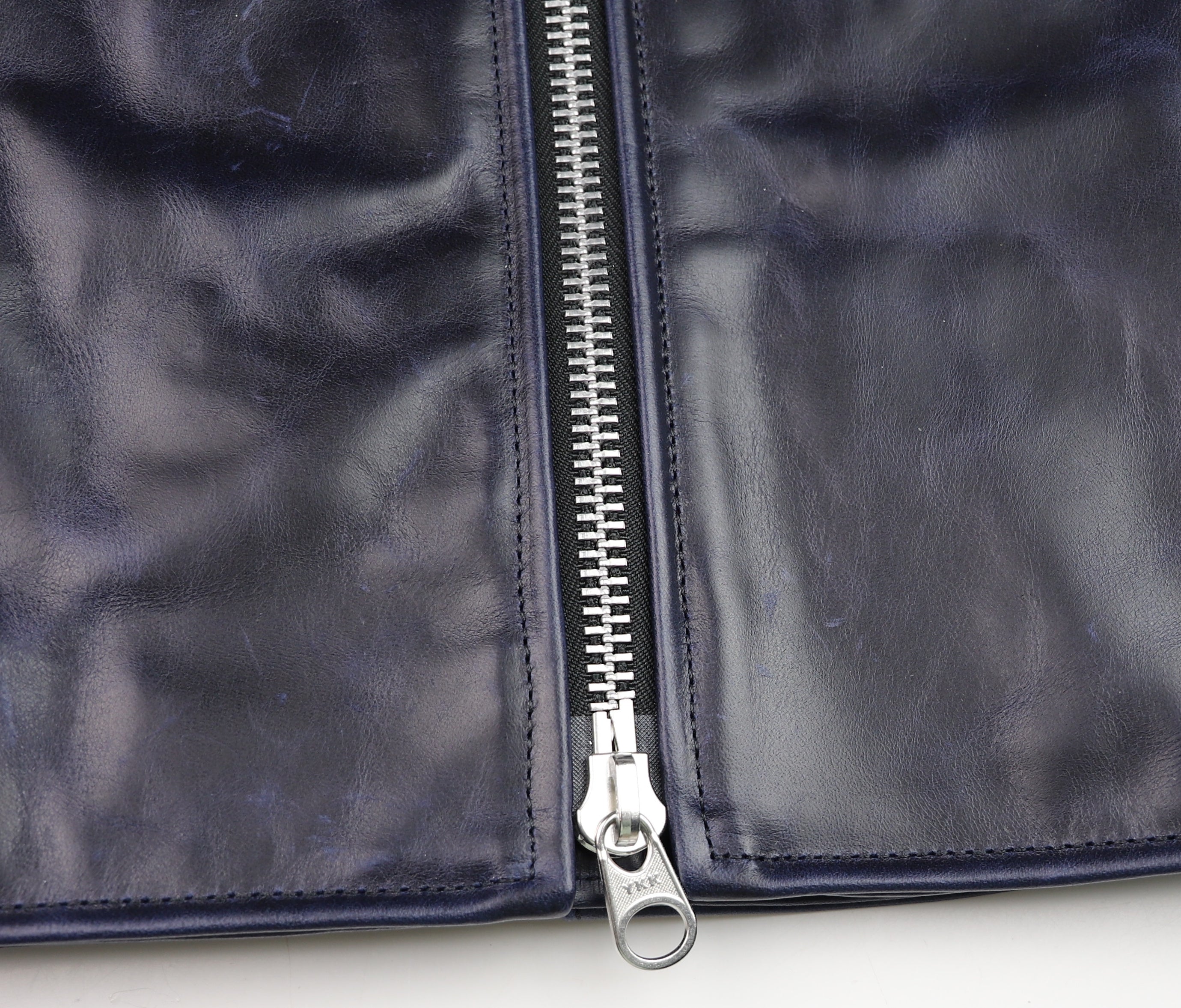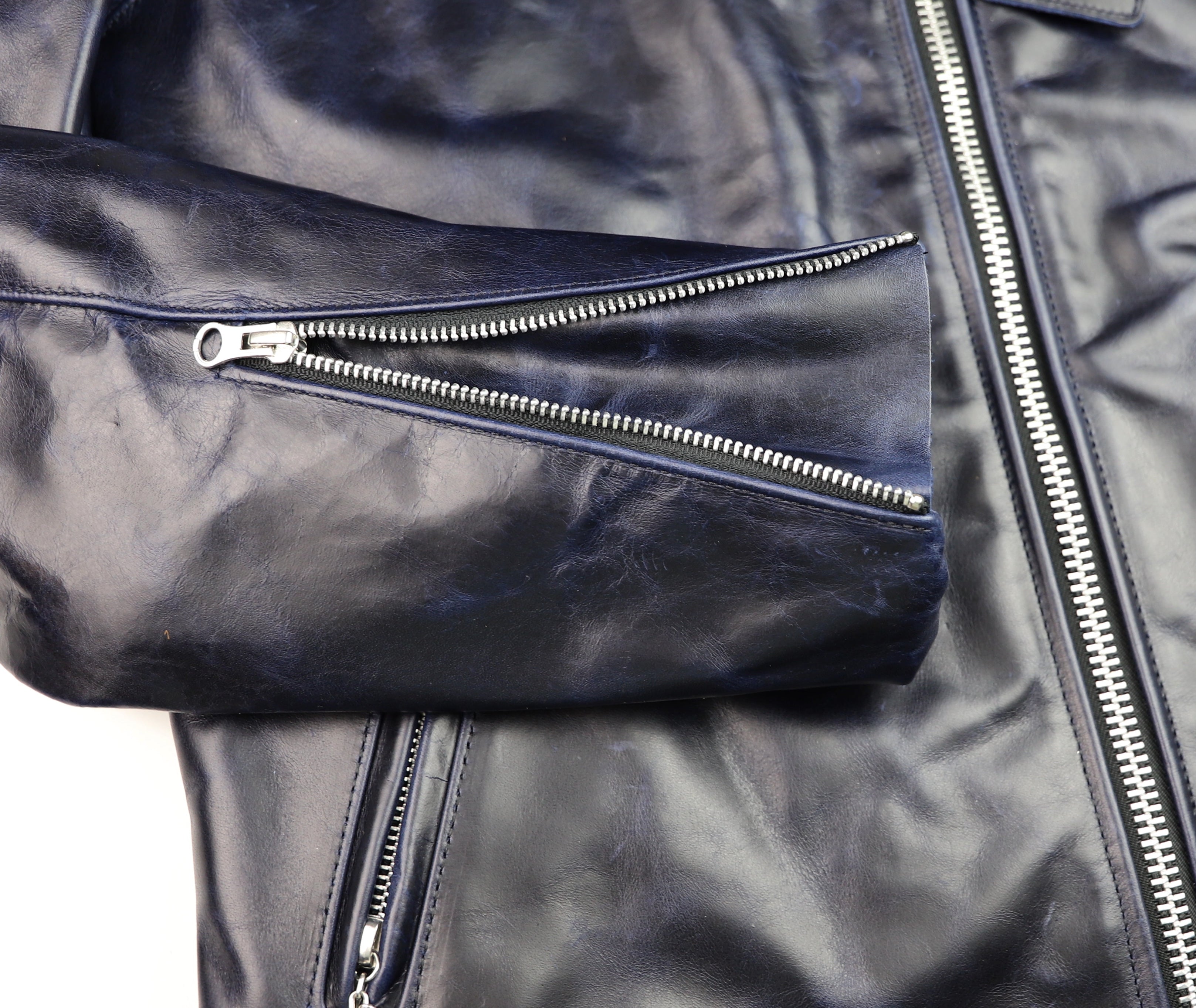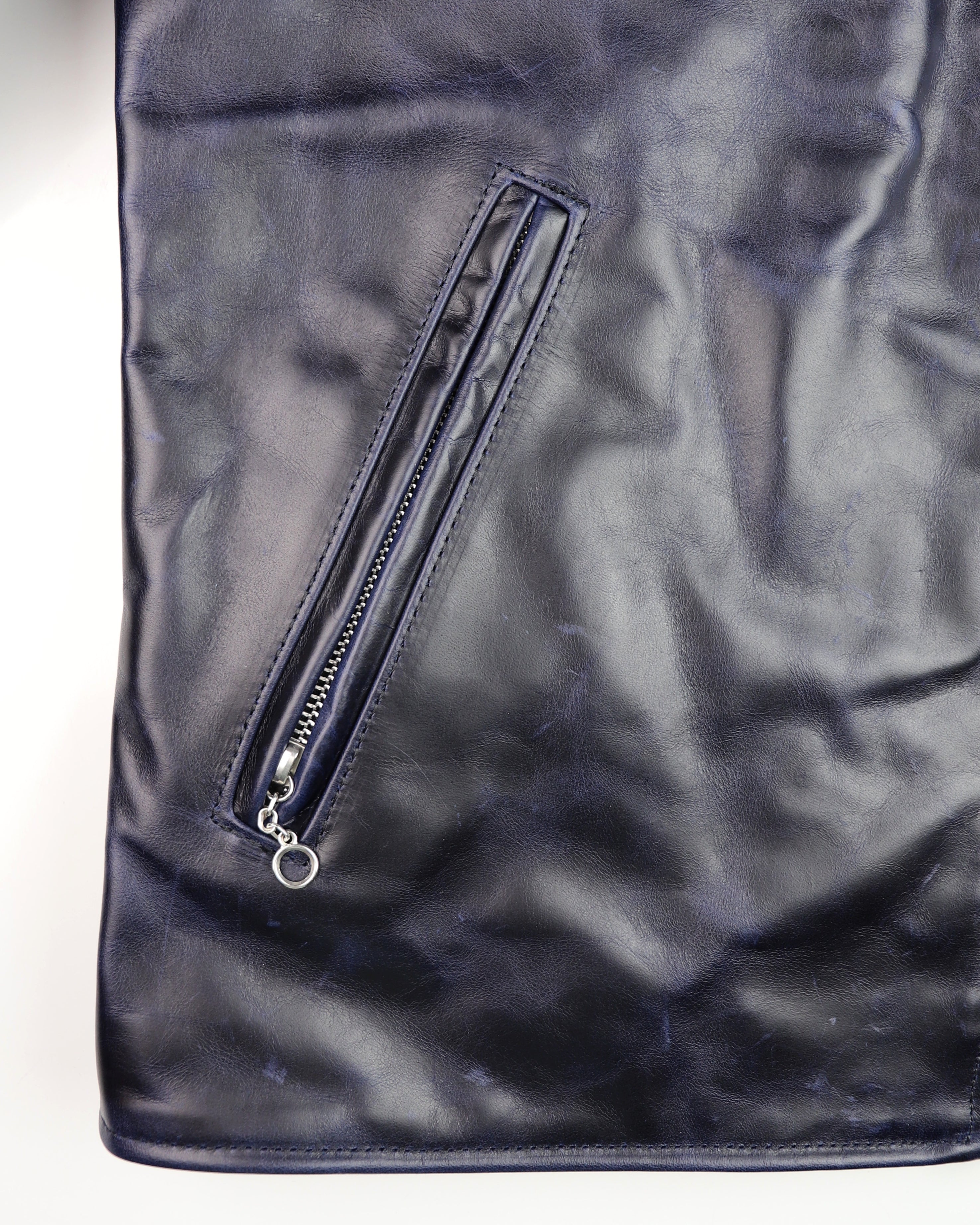 Thurston x Vanson Oxford Jacket! This Slimfit Oxford is customized for our shop--this jacket is made with Abyss Blue Bainbridge cowhide and nickel hardware. It has a lightweight black rayon lining, shoulder gussets, adjustable side straps, and a right side interior pocket.