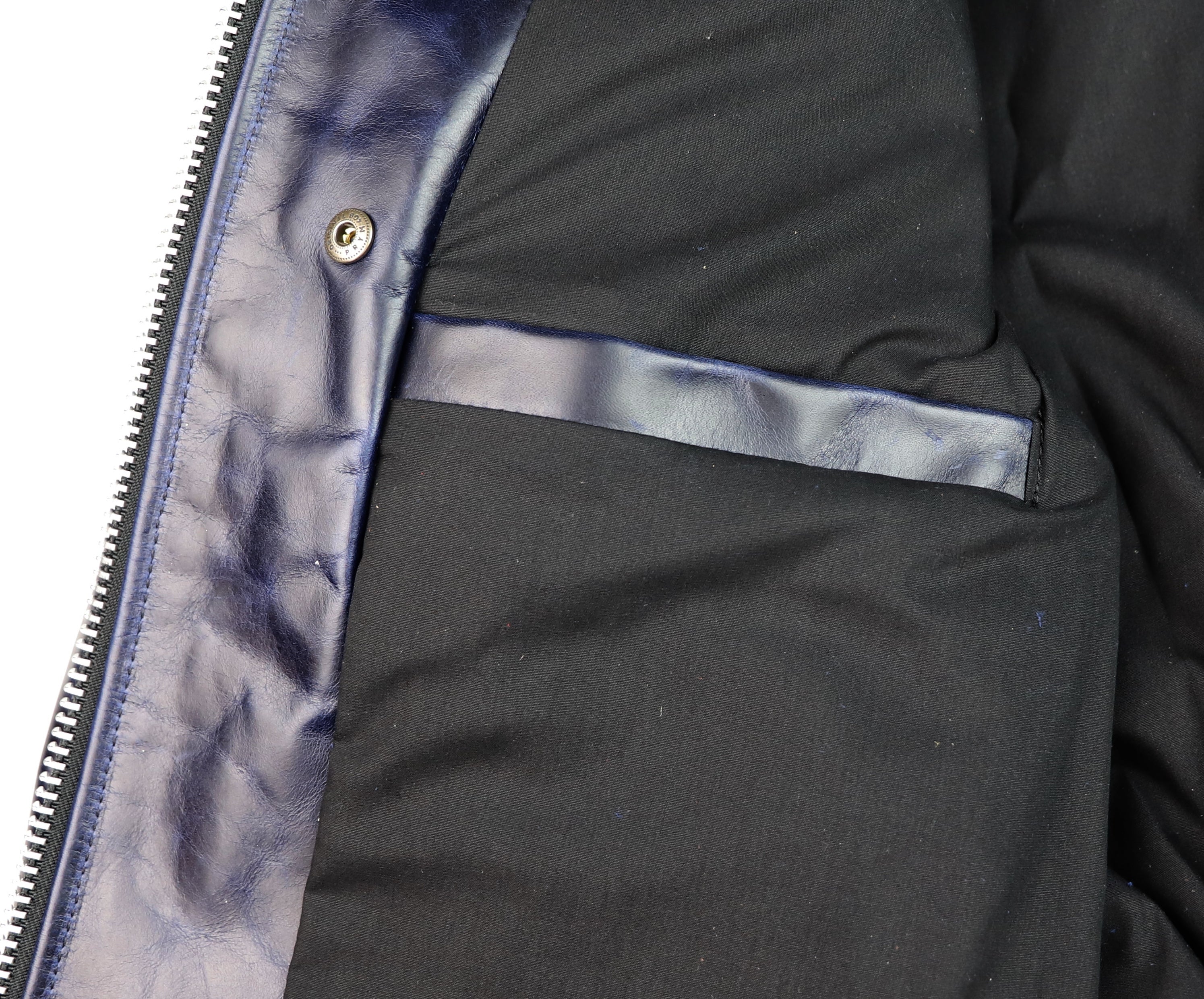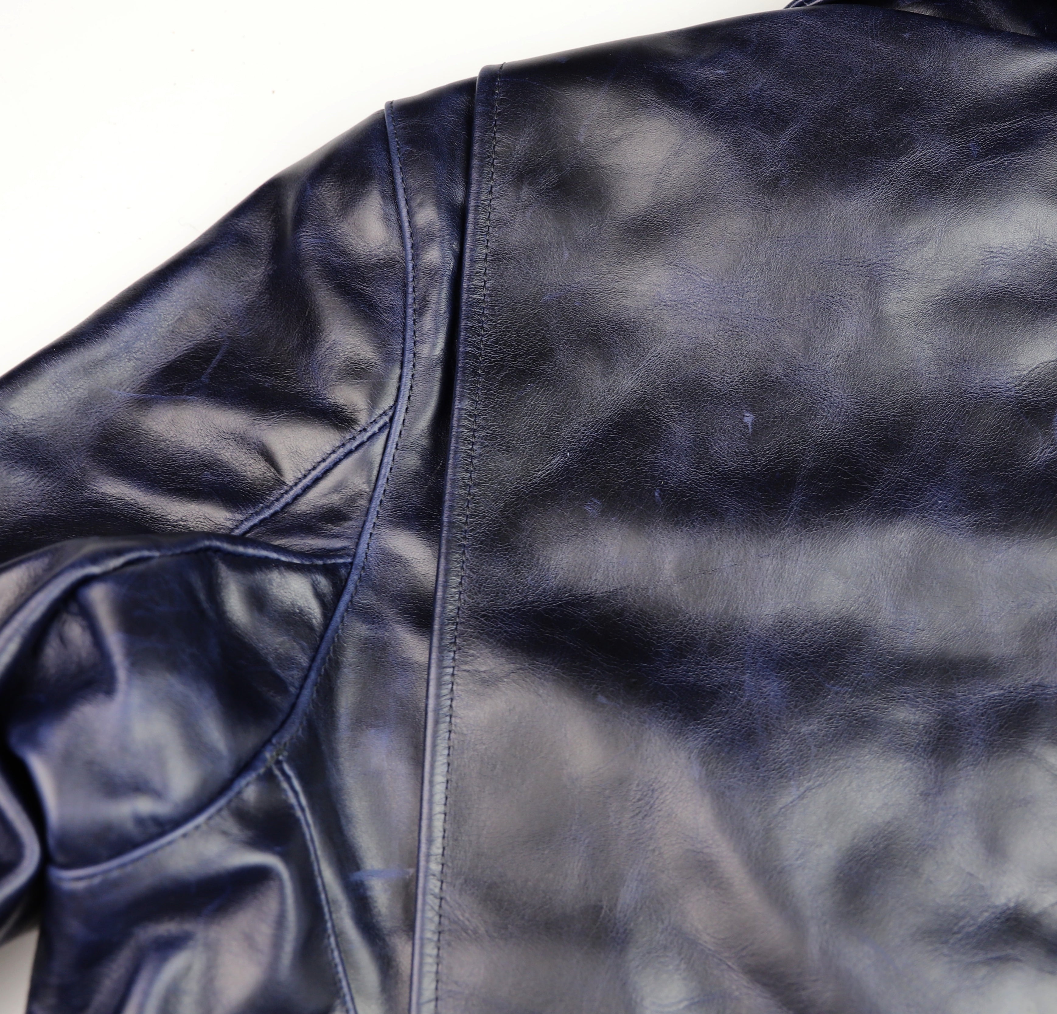 Our Bainbridge leather is a full grain bovine hide sourced from an Old World tannery with over a century and a half of heritage. This leather is chrome-tanned with a dramatic pull-up effect and develops a fantastic classic patina. Thickness is approximately 1.2 mm. We’ve hand-selected this leather for its transformational qualities and vintage appeal. This leather starts off smooth and firm, yet develops full grain character and a supple feel within a few hours of wear. Our Bainbridge displays all the characteristics of full grain Old World leather at a modern pace. Bainbridge is available from Thurston Bros. for off-the-rack and custom jackets.