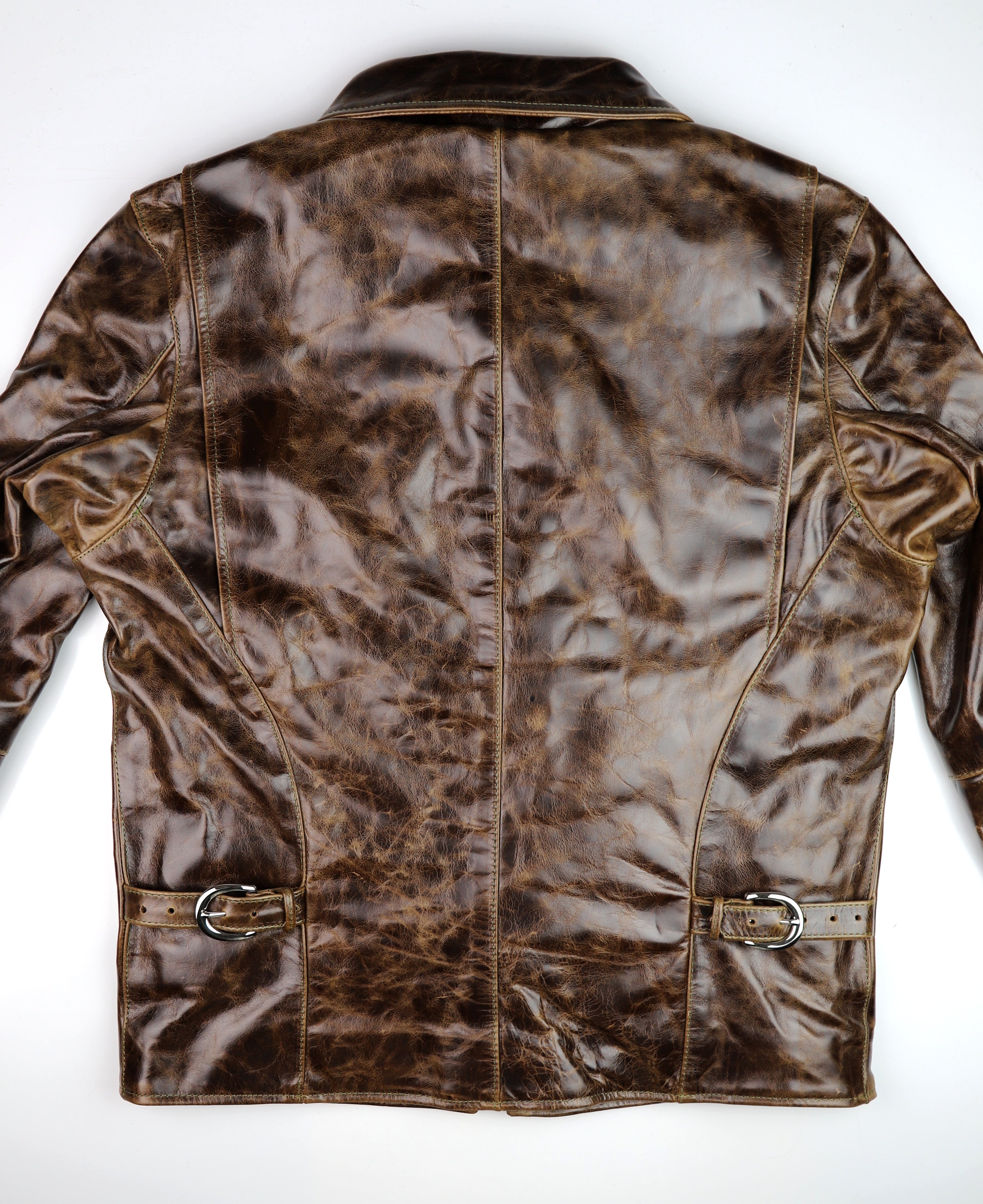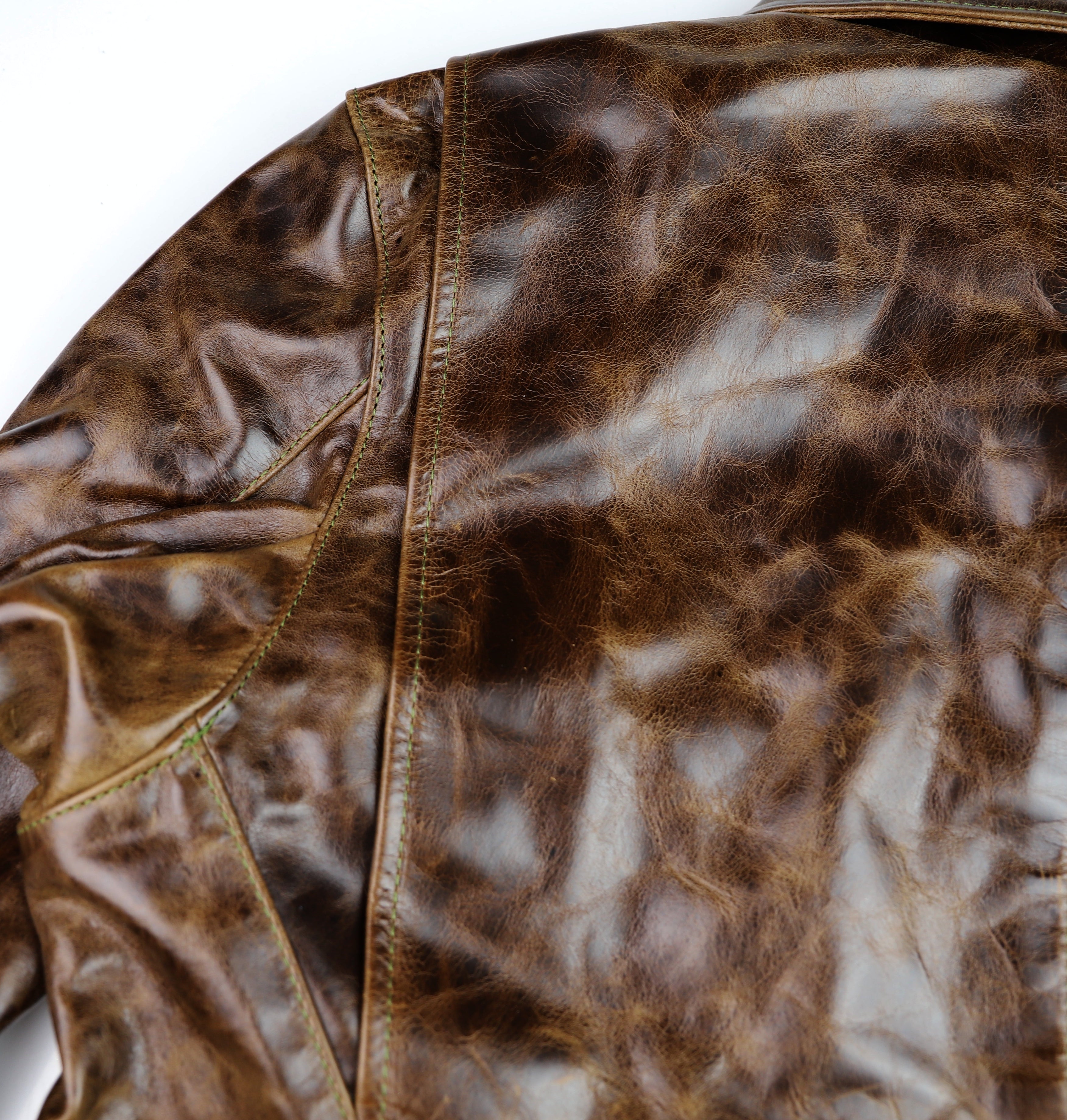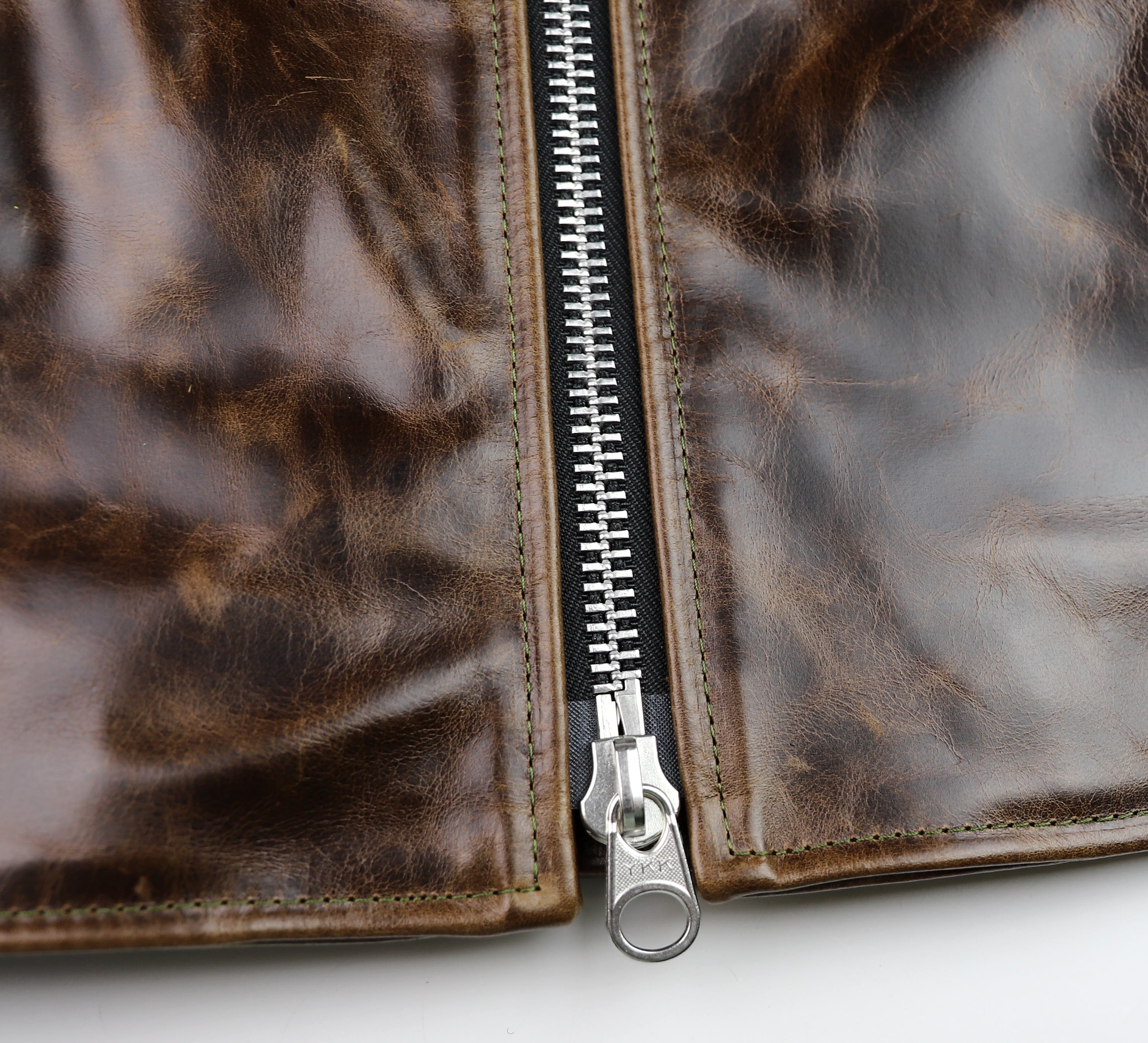 Our Bainbridge leather is a full grain bovine hide sourced from an Old World tannery with over a century and a half of heritage. This leather is chrome-tanned with a dramatic pull-up effect and develops a fantastic classic patina. Thickness is approximately 1.2 mm. We’ve hand-selected this leather for its transformational qualities and vintage appeal. This leather starts off smooth and firm, yet develops full grain character and a supple feel within a few hours of wear. Our Bainbridge displays all the characteristics of full grain Old World leather at a modern pace. Bainbridge is available from Thurston Bros. for off-the-rack and custom jackets.