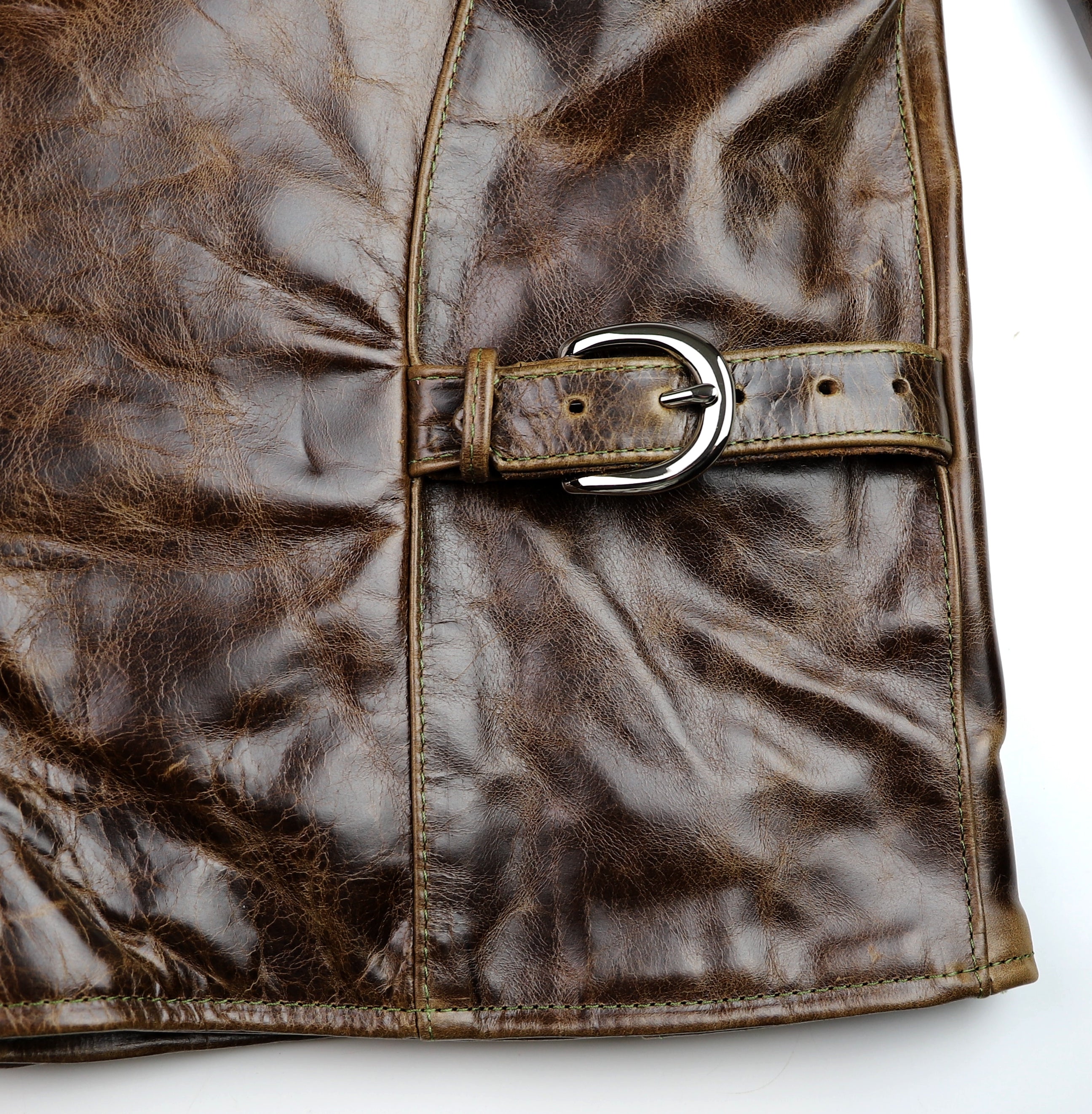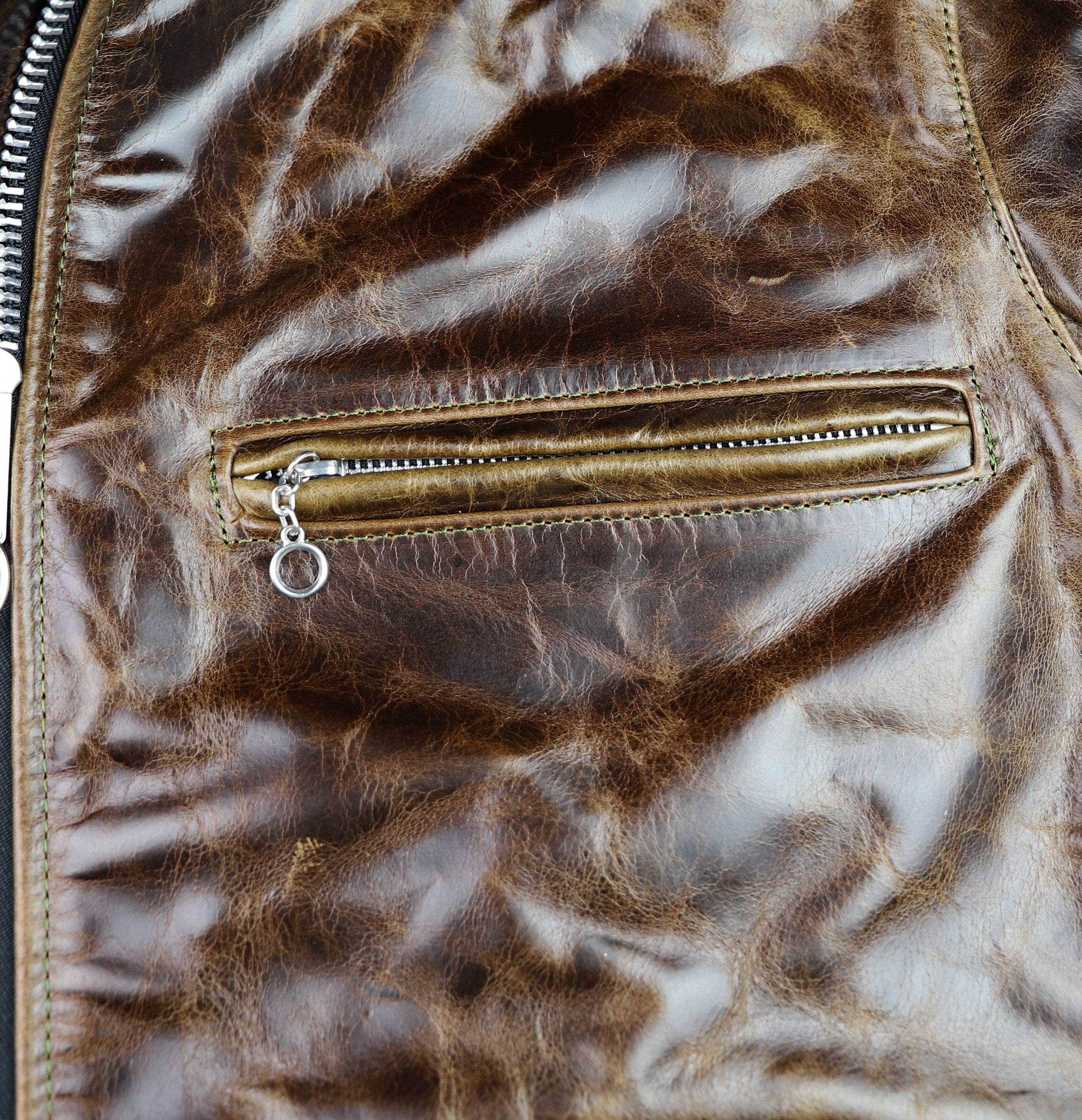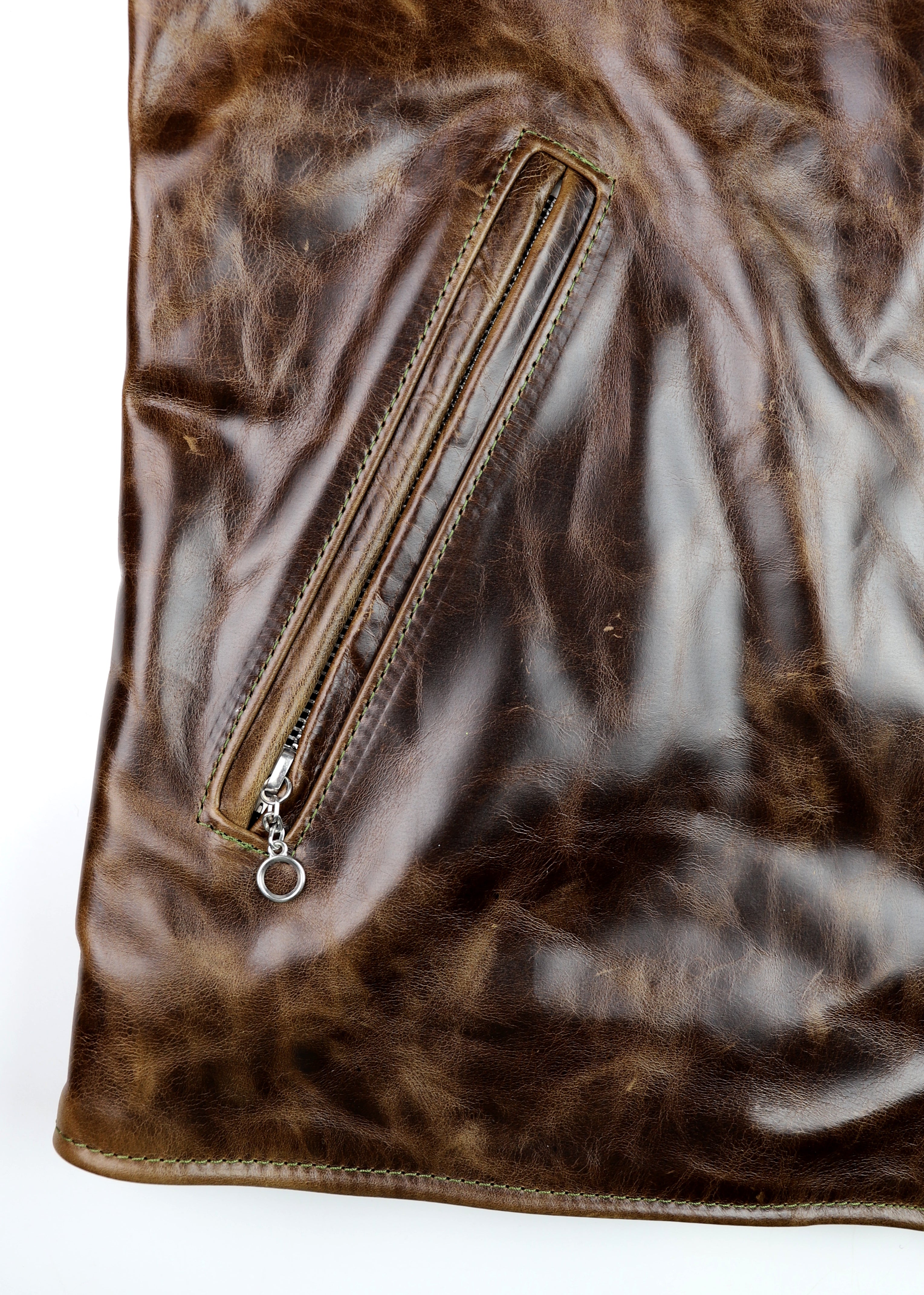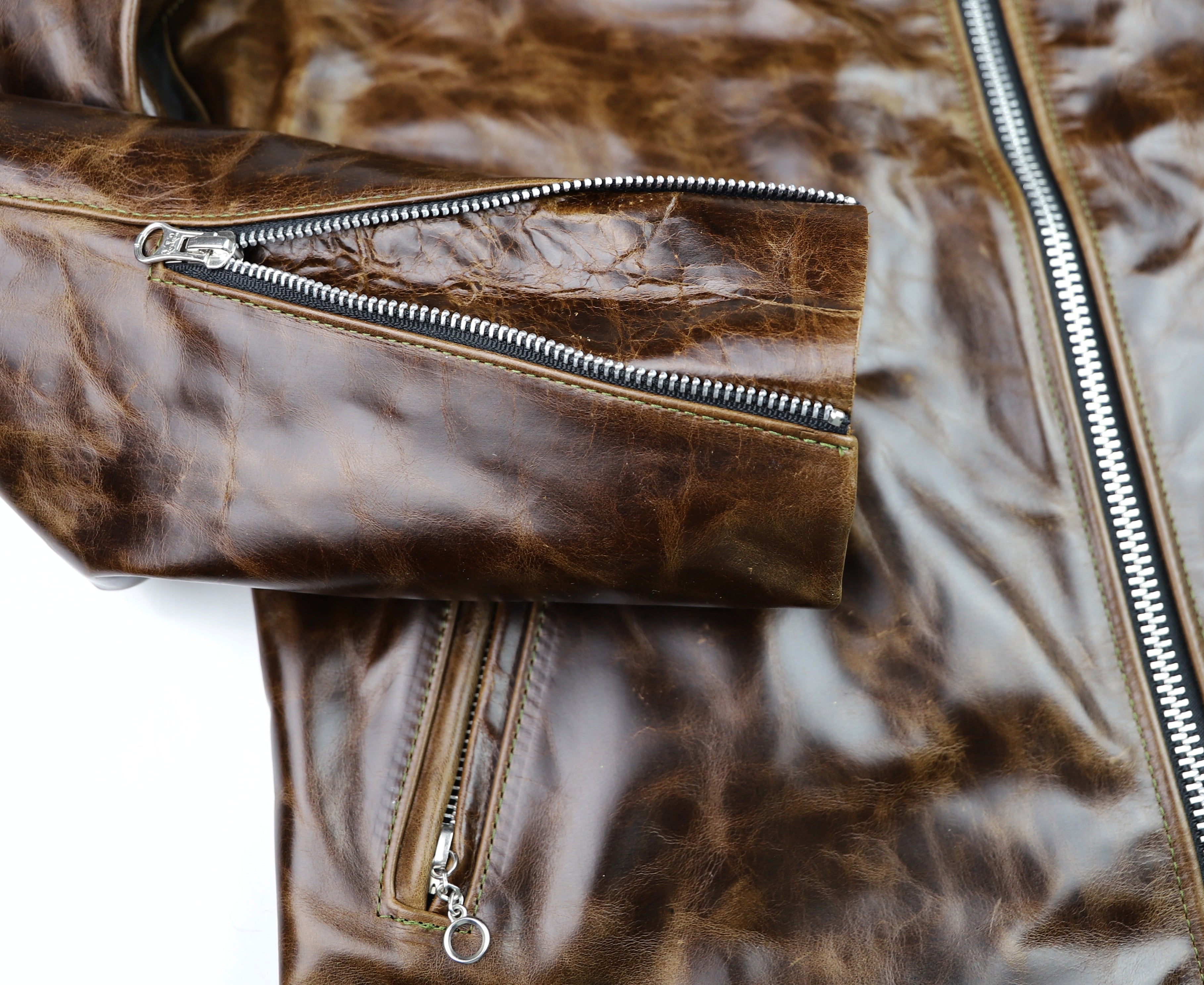 Our Bainbridge leather is a full grain bovine hide sourced from an Old World tannery with over a century and a half of heritage. This leather is chrome-tanned with a dramatic pull-up effect and develops a fantastic classic patina. Thickness is approximately 1.2 mm. We’ve hand-selected this leather for its transformational qualities and vintage appeal. This leather starts off smooth and firm, yet develops full grain character and a supple feel within a few hours of wear. Our Bainbridge displays all the characteristics of full grain Old World leather at a modern pace. Bainbridge is available from Thurston Bros. for off-the-rack and custom jackets.