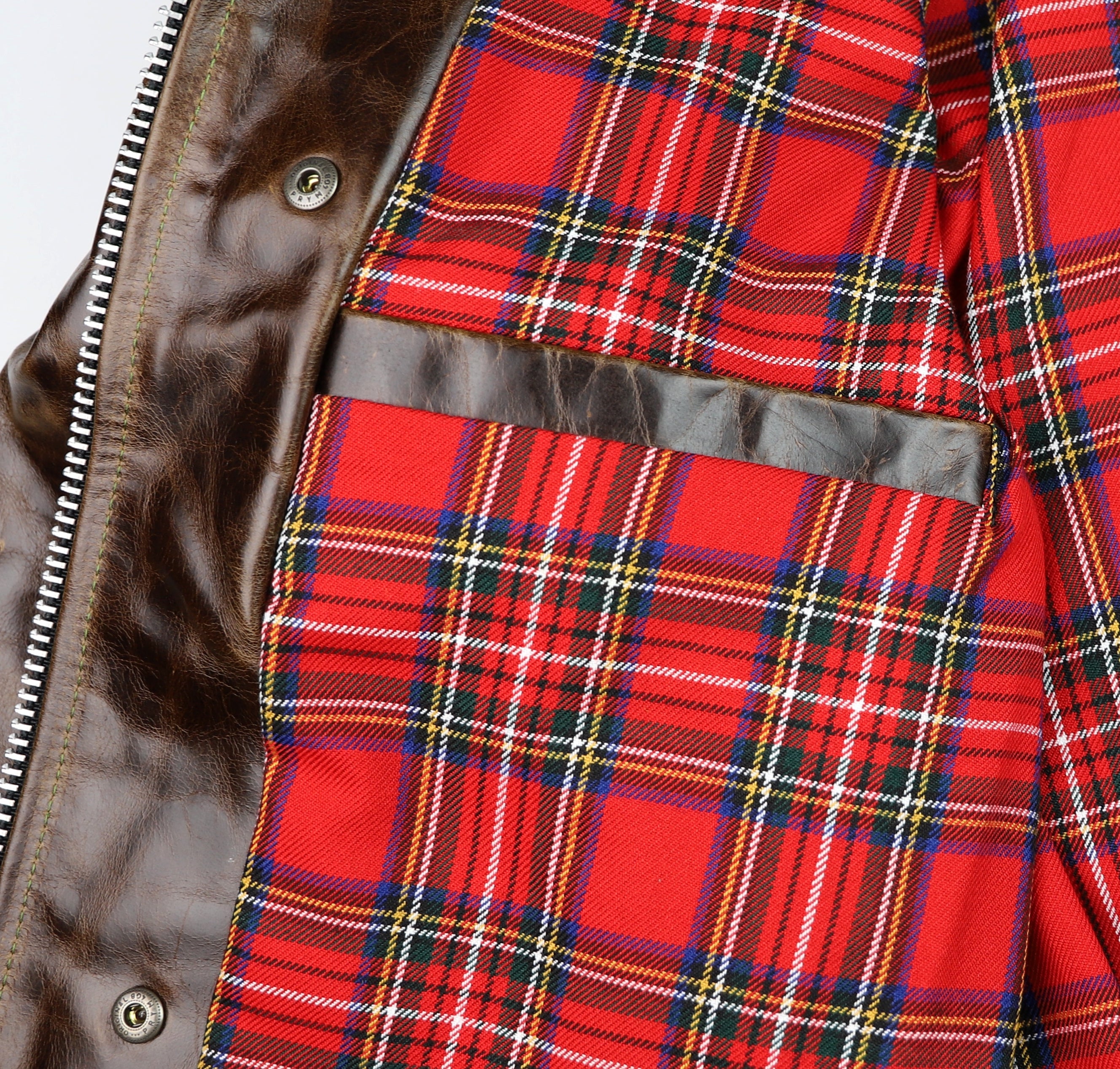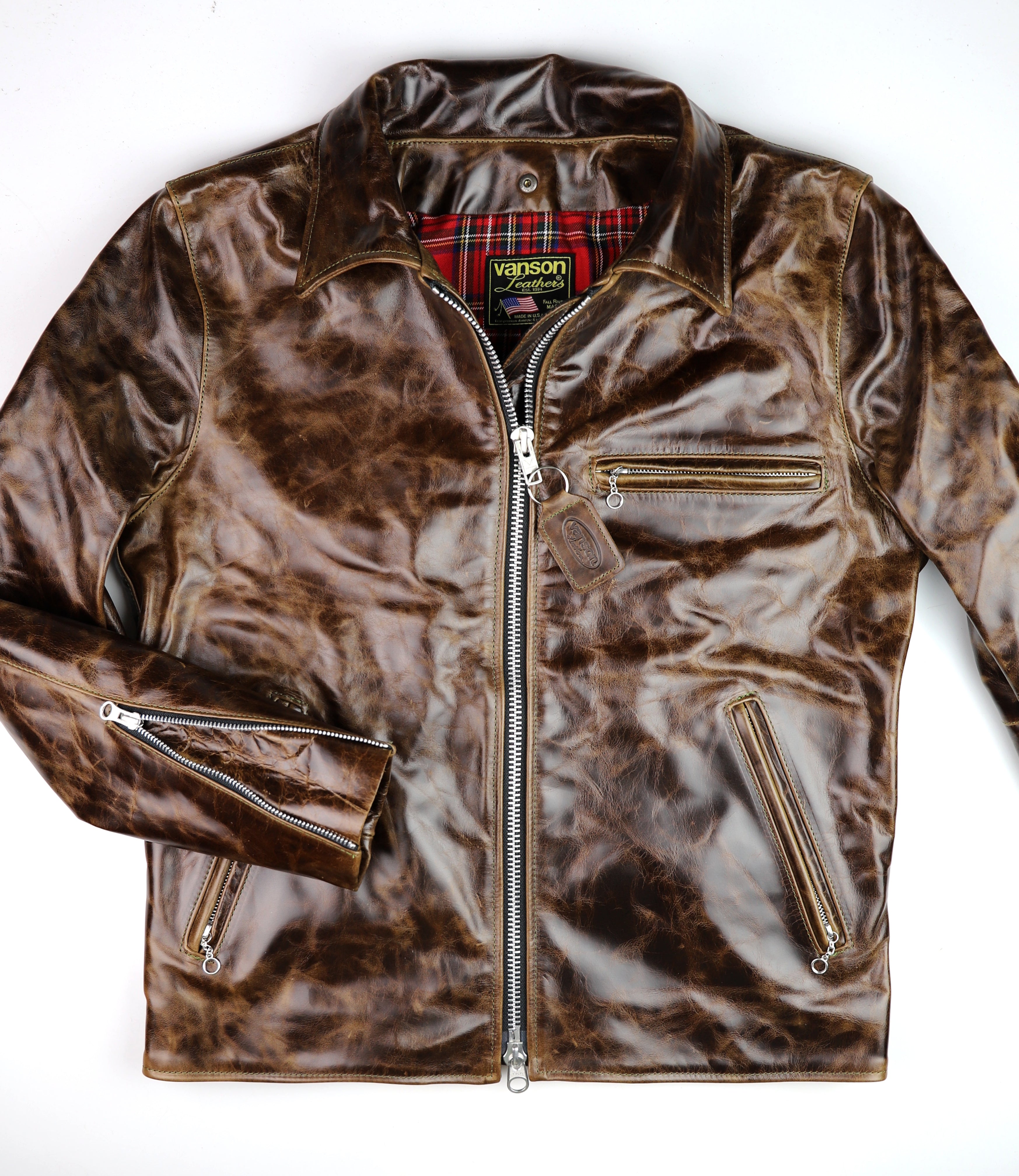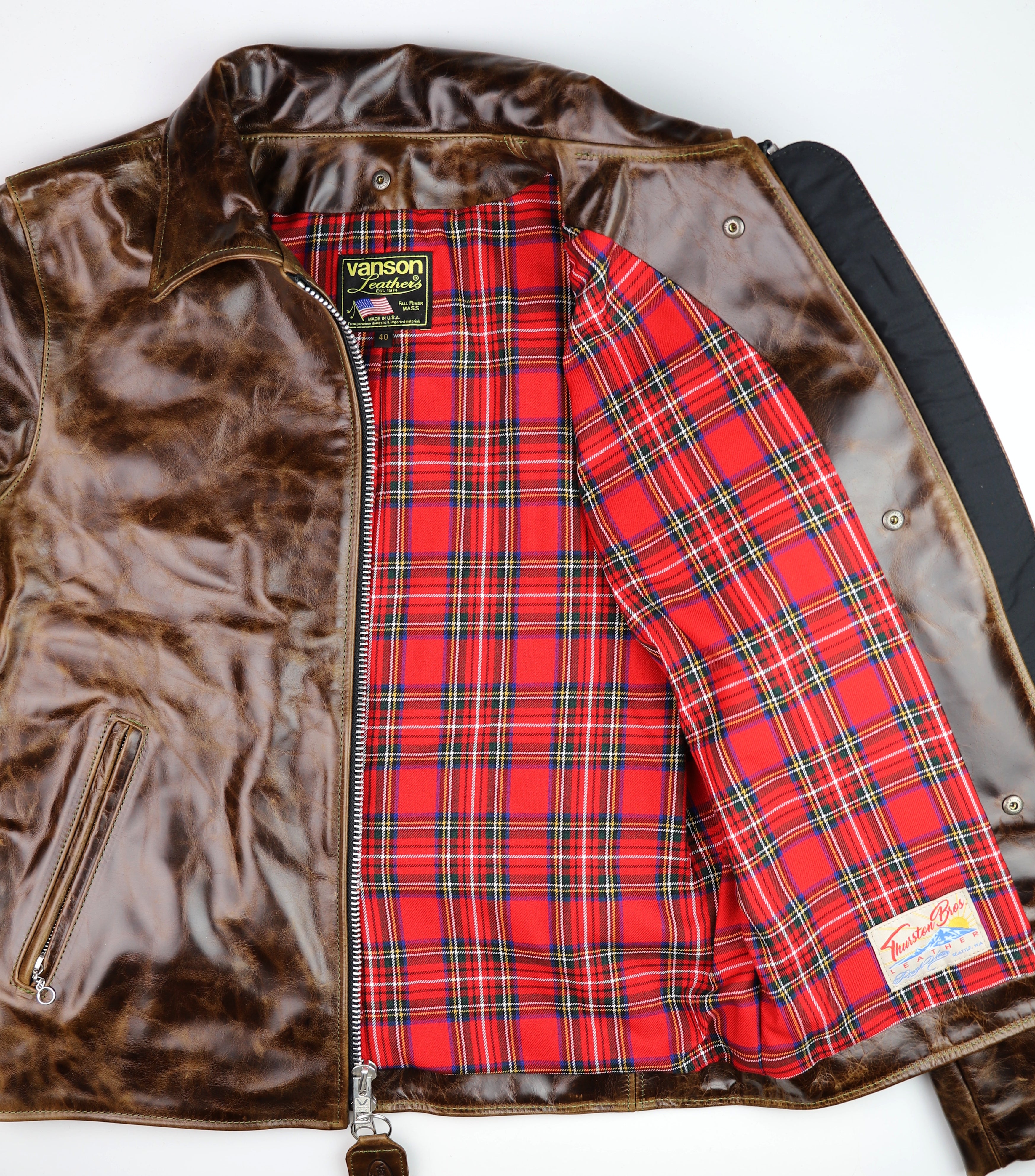 Thurston x Vanson Oxford Jacket! This Slimfit Oxford is customized for our shop--this jacket is made with Dark Maple Bainbridge cowhide and nickel hardware. It has a lightweight red plaid rayon lining, shoulder gussets, adjustable side straps, and a right side interior pocket.