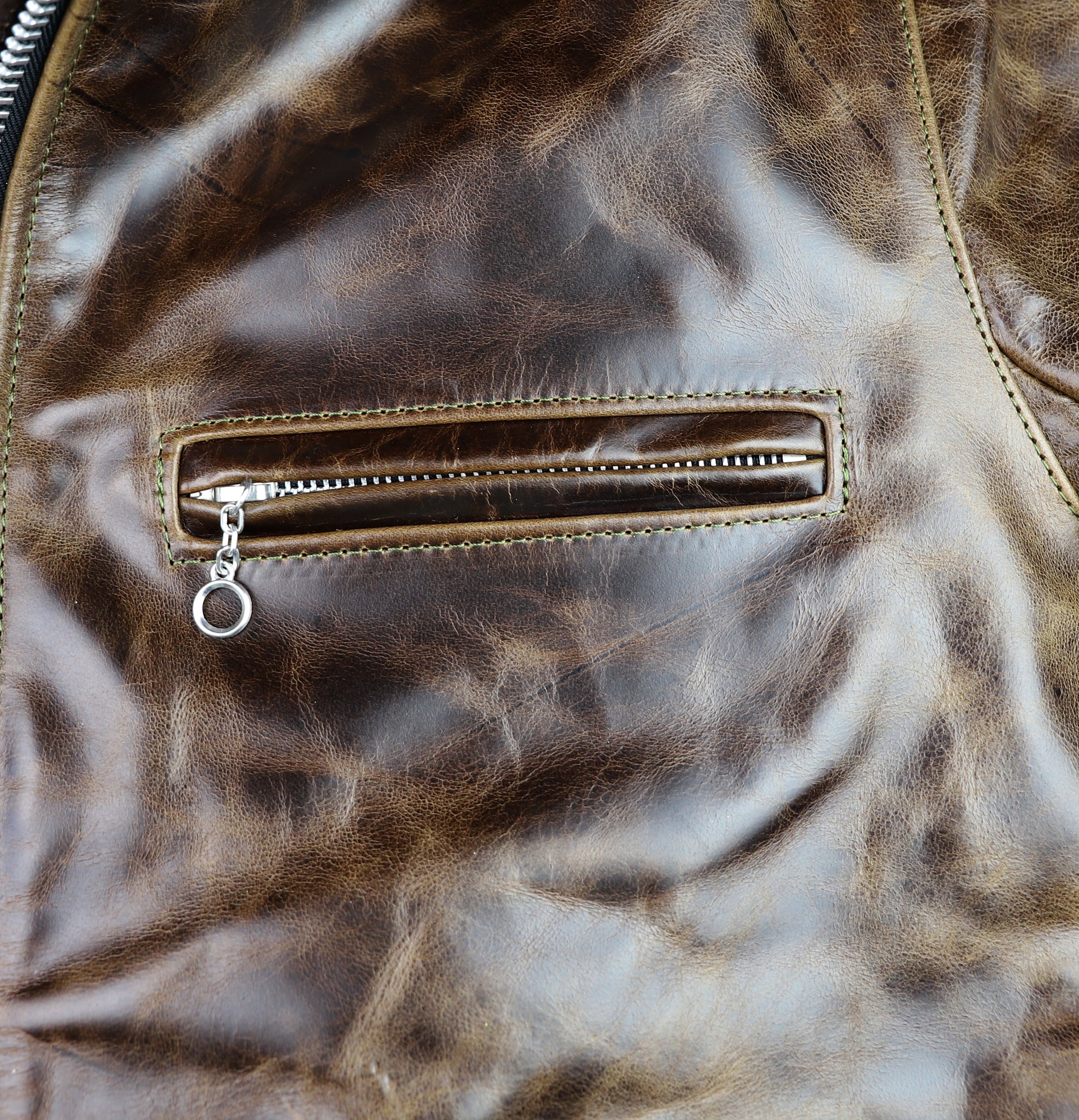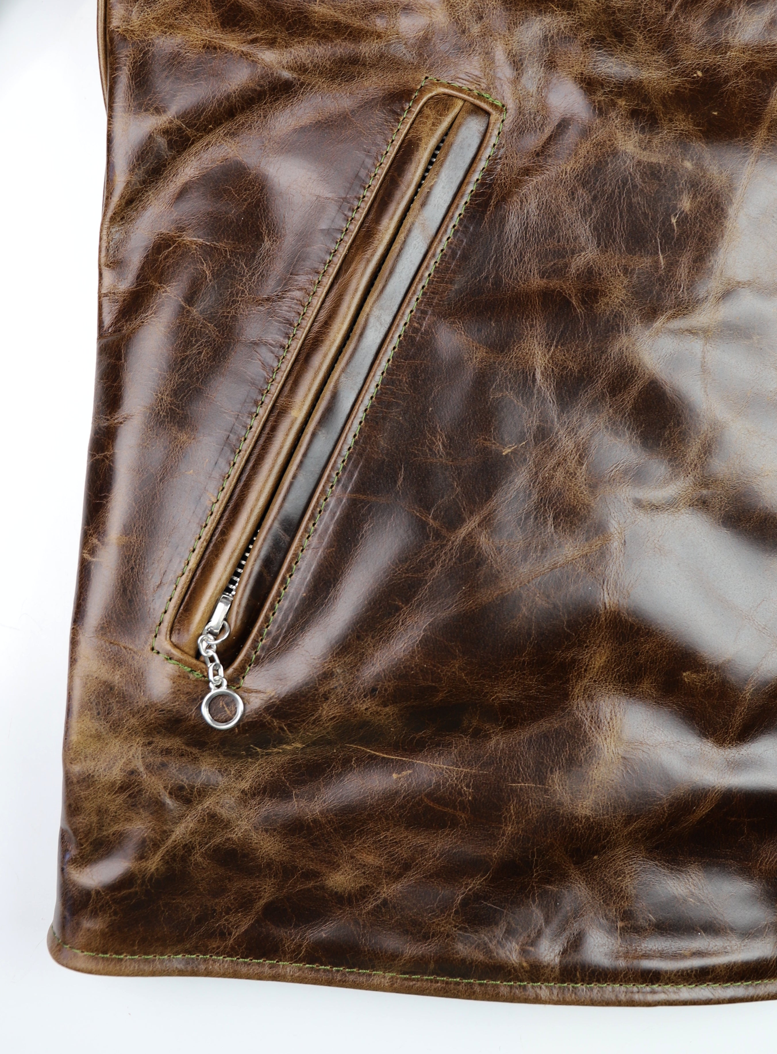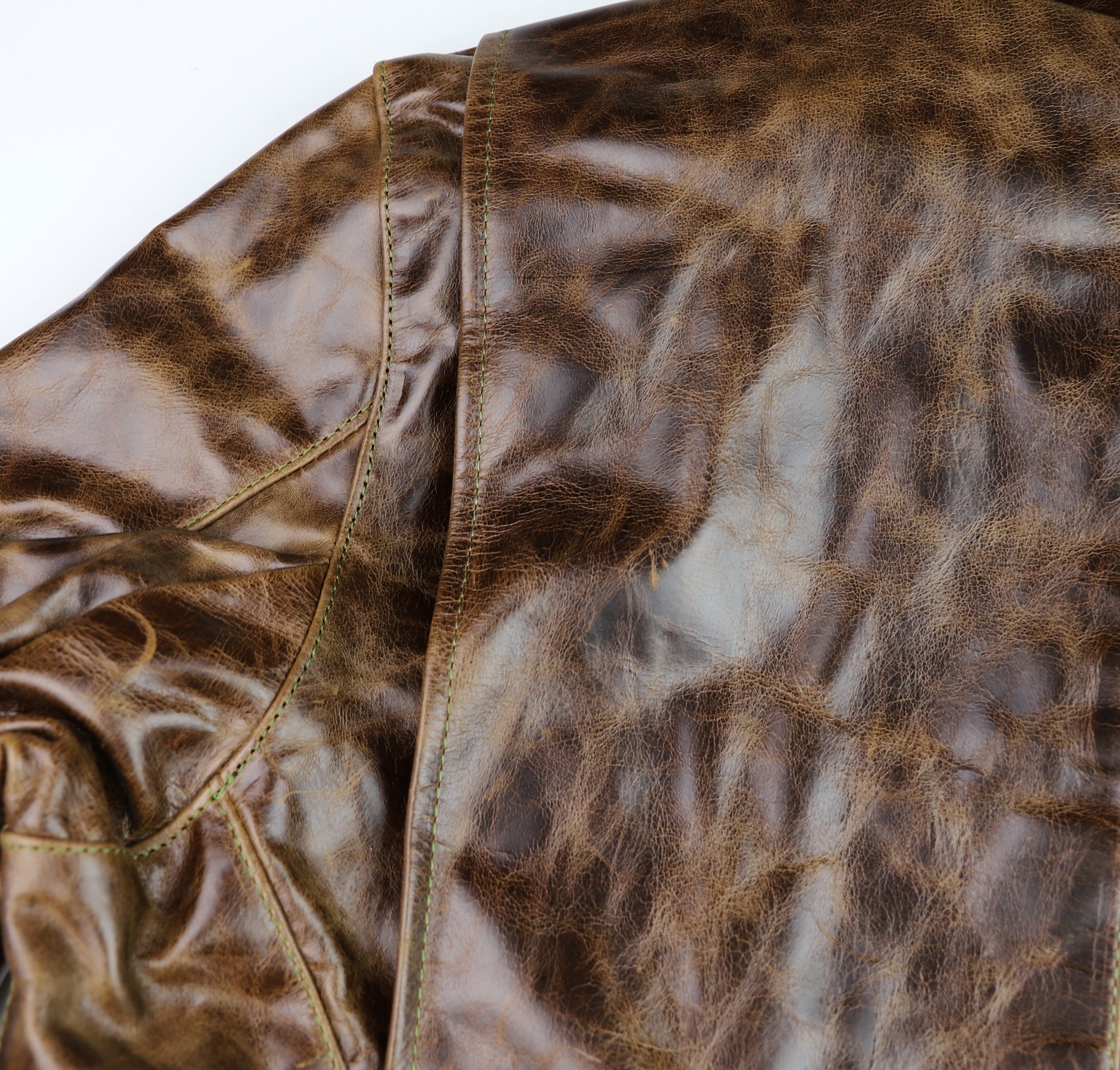 Our Bainbridge leather is a full grain bovine hide sourced from an Old World tannery with over a century and a half of heritage.  This leather is chrome-tanned with a dramatic pull-up effect and develops a fantastic classic patina.  Thickness is approximately 1.2 mm.  We’ve hand-selected this leather for its transformational qualities and vintage appeal.  This leather starts off smooth and firm, yet develops full grain character and a supple feel within a few hours of wear.  Our Bainbridge displays all the characteristics of full grain Old World leather at a modern pace.  Bainbridge is available from Thurston Bros. for off-the-rack and custom jackets.