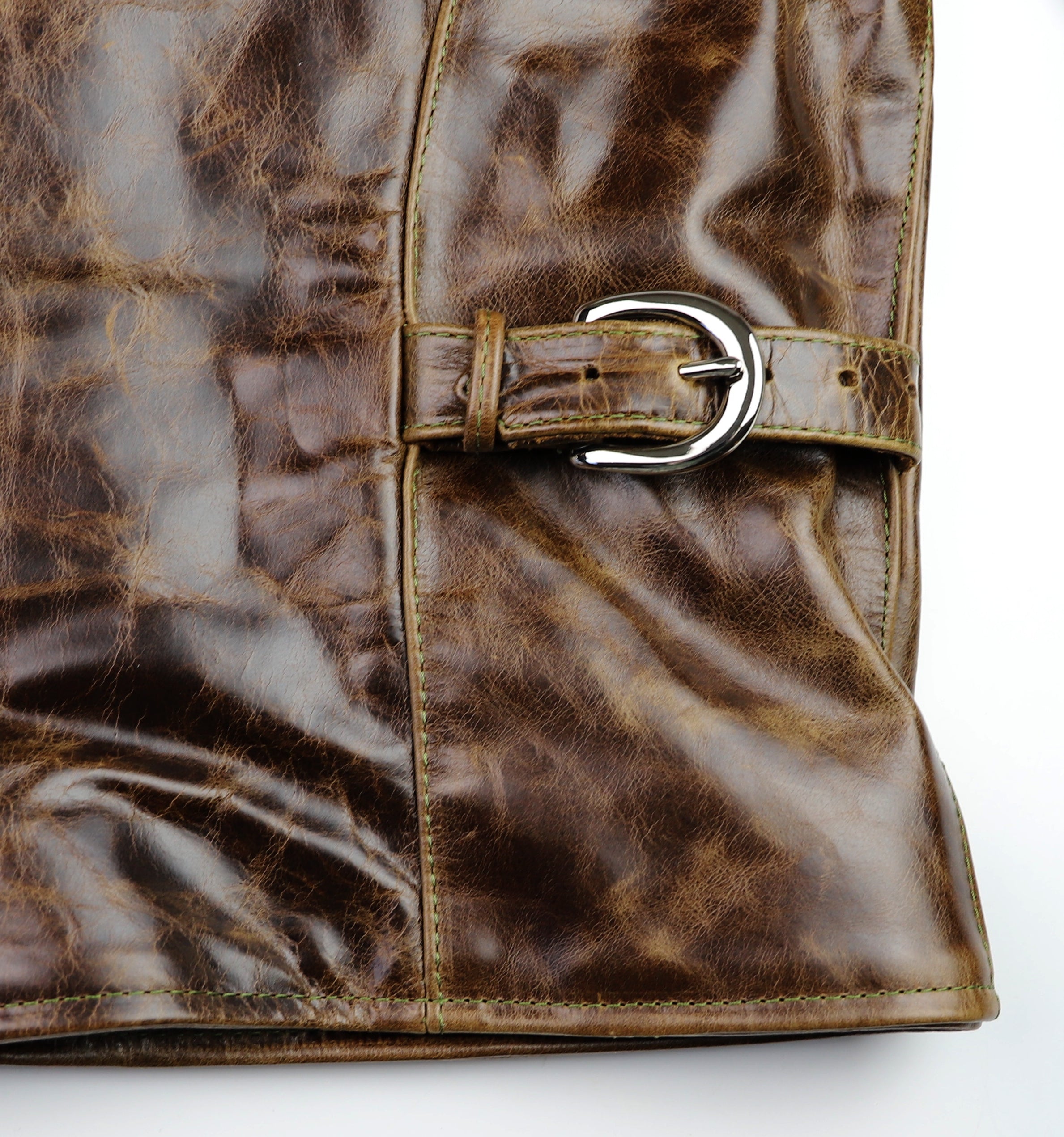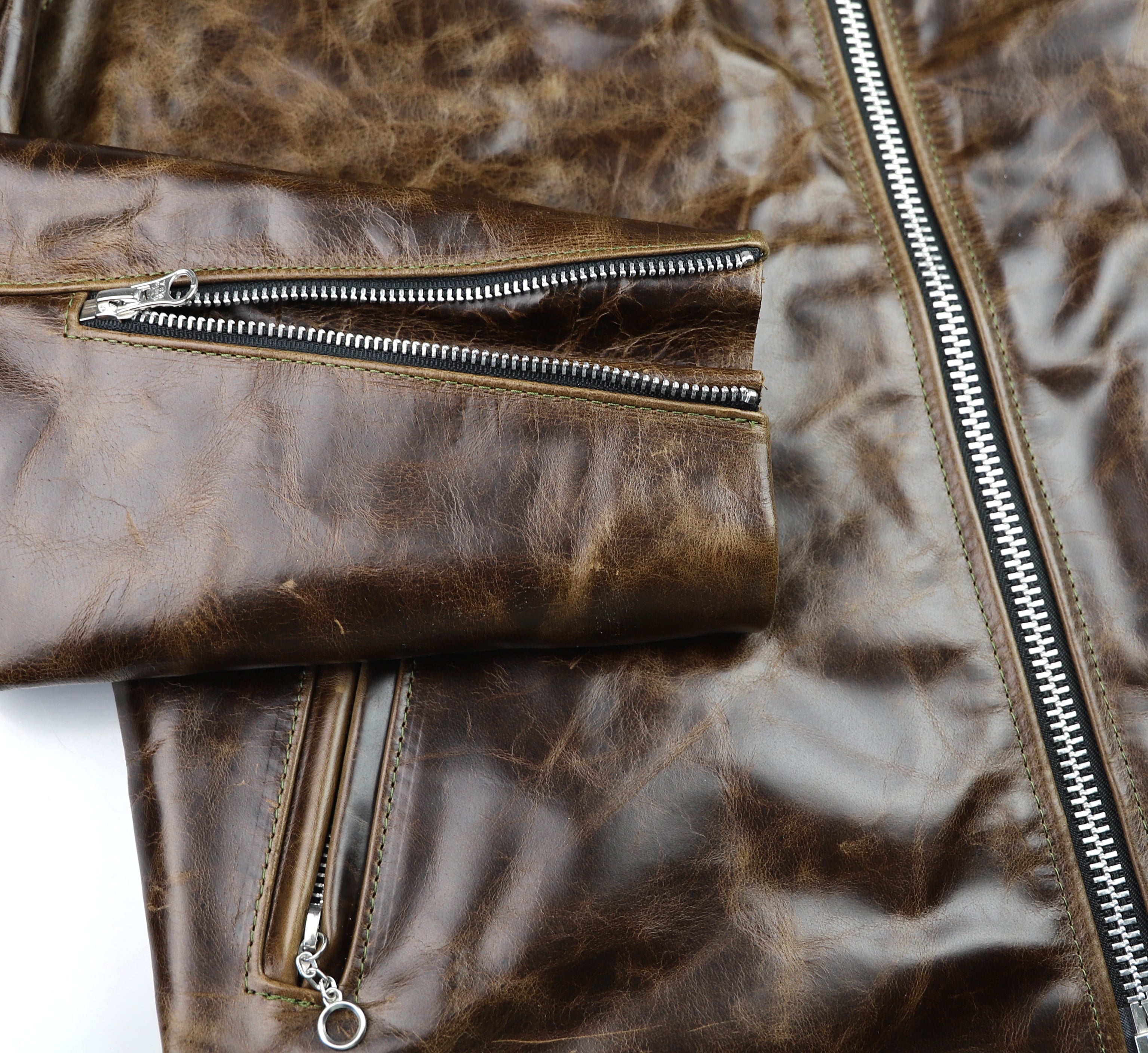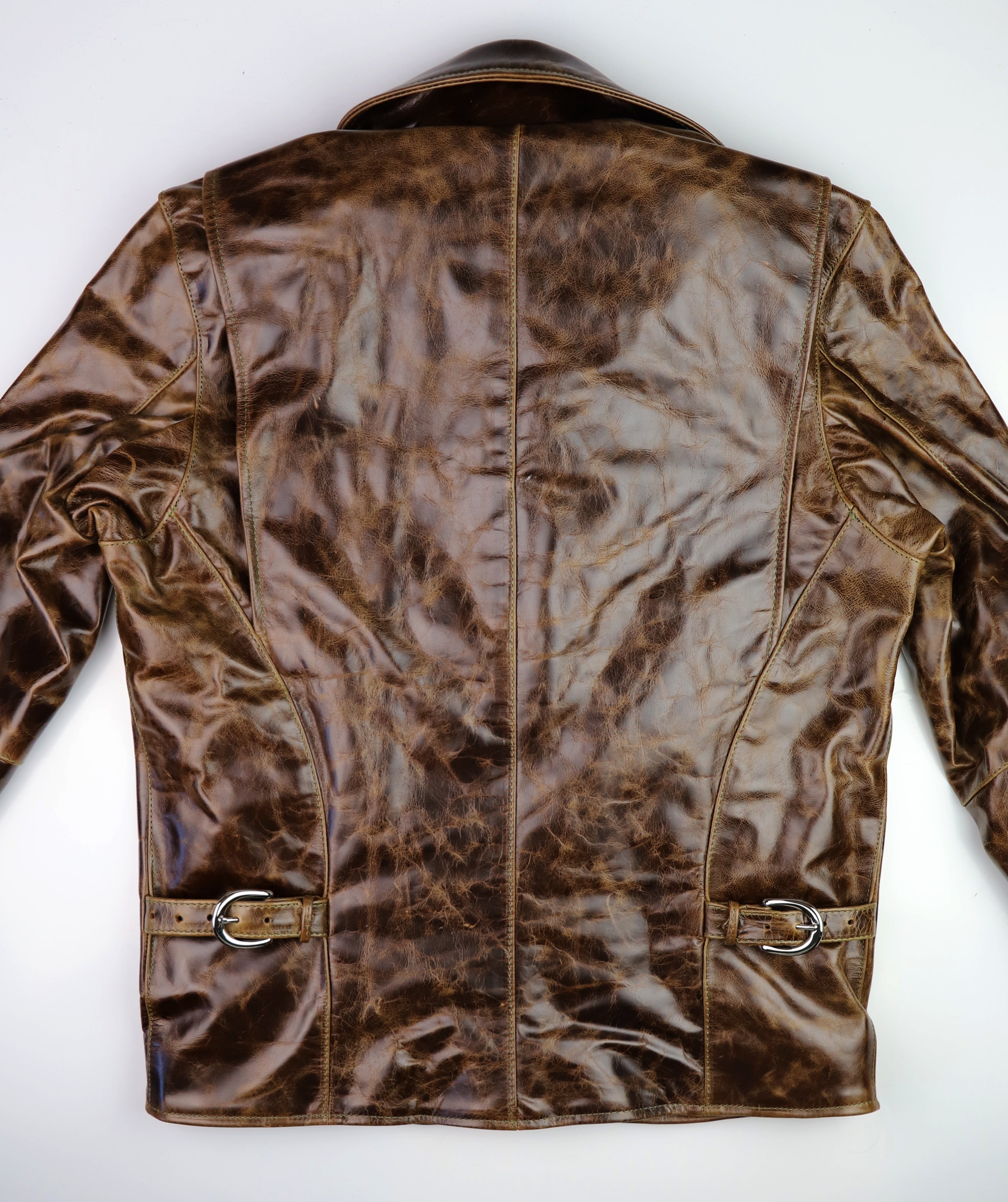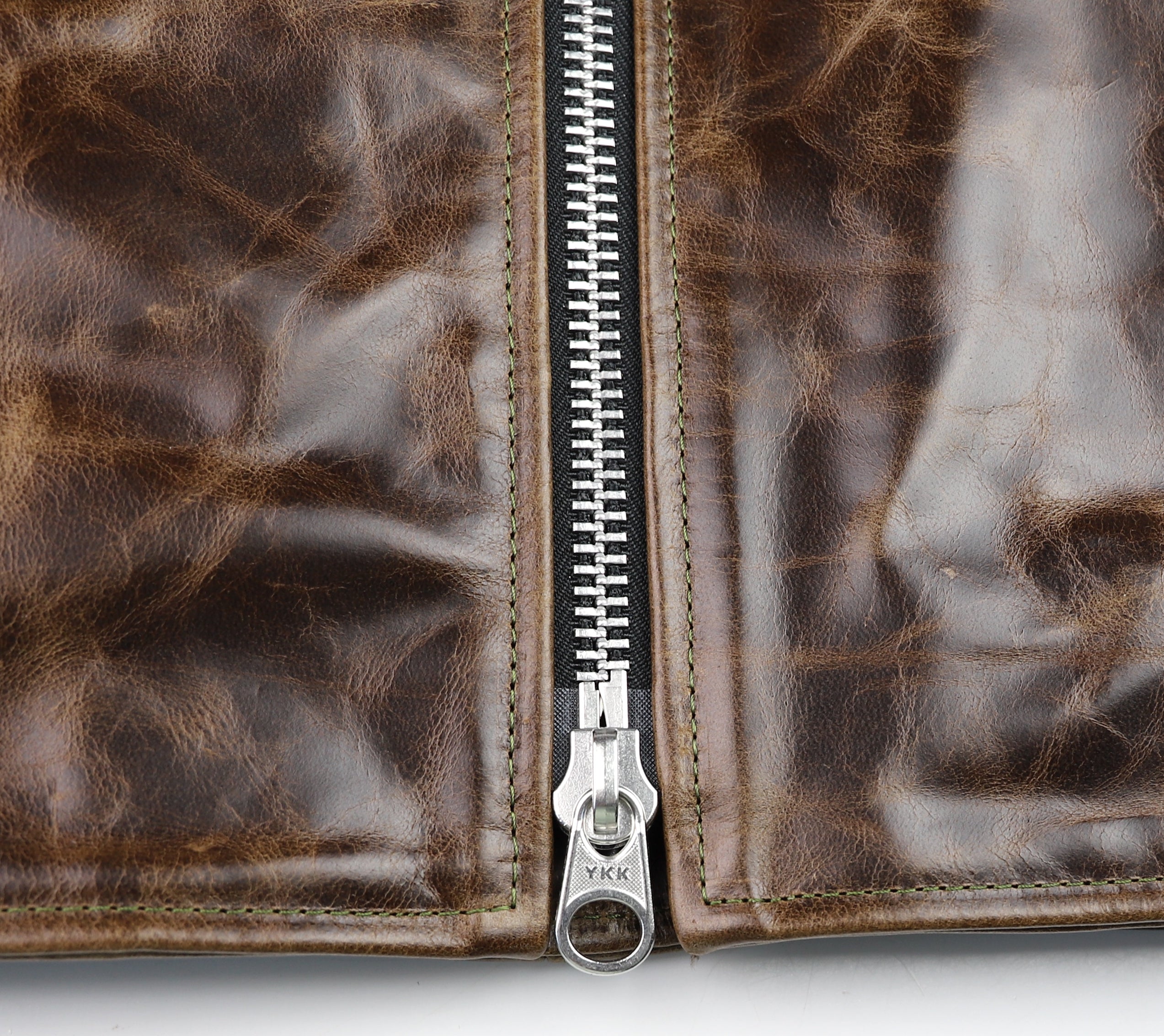 Our Bainbridge leather is a full grain bovine hide sourced from an Old World tannery with over a century and a half of heritage.  This leather is chrome-tanned with a dramatic pull-up effect and develops a fantastic classic patina.  Thickness is approximately 1.2 mm.  We’ve hand-selected this leather for its transformational qualities and vintage appeal.  This leather starts off smooth and firm, yet develops full grain character and a supple feel within a few hours of wear.  Our Bainbridge displays all the characteristics of full grain Old World leather at a modern pace.  Bainbridge is available from Thurston Bros. for off-the-rack and custom jackets.