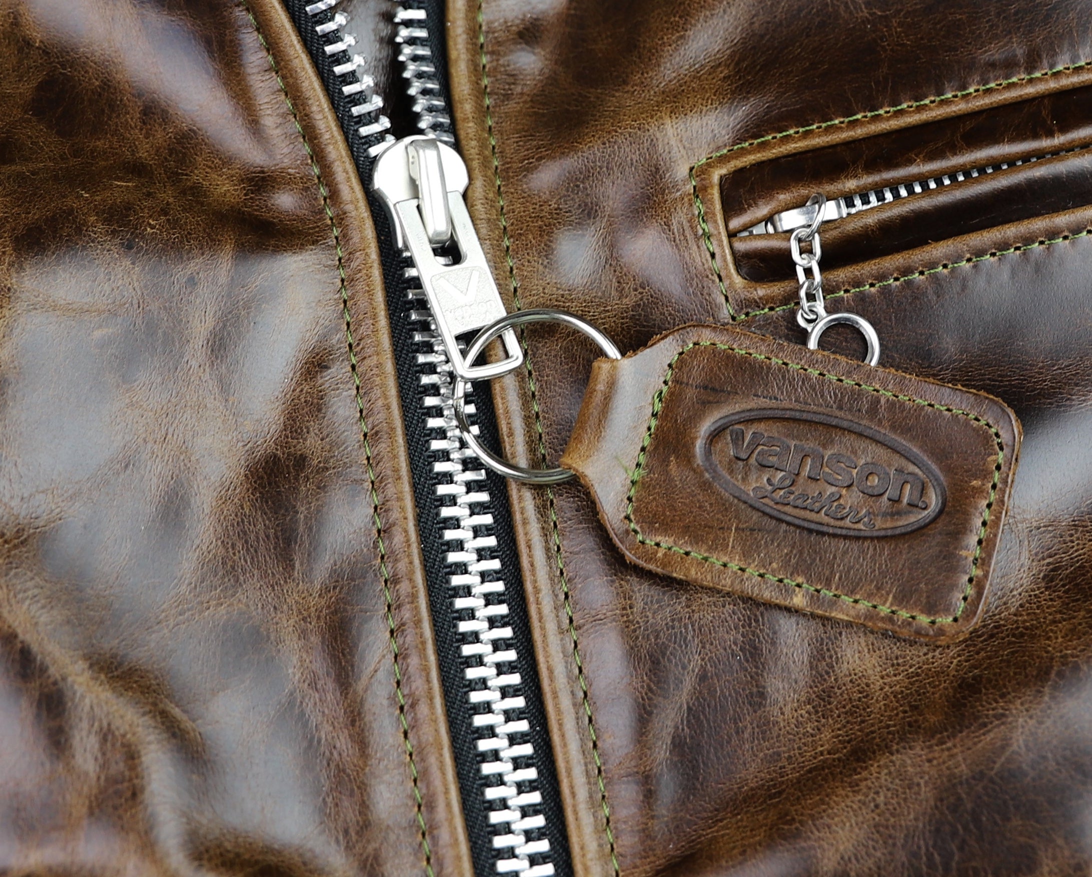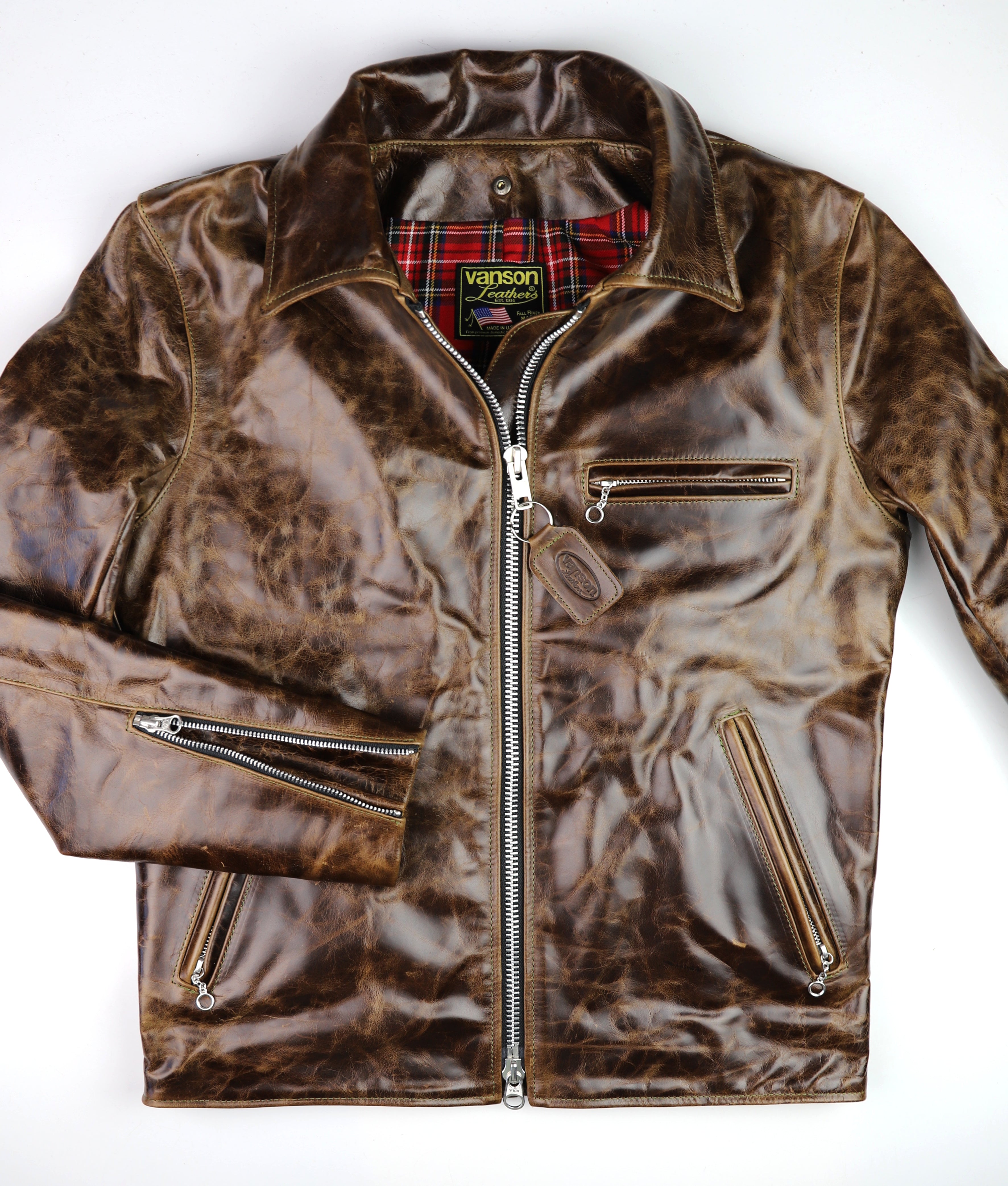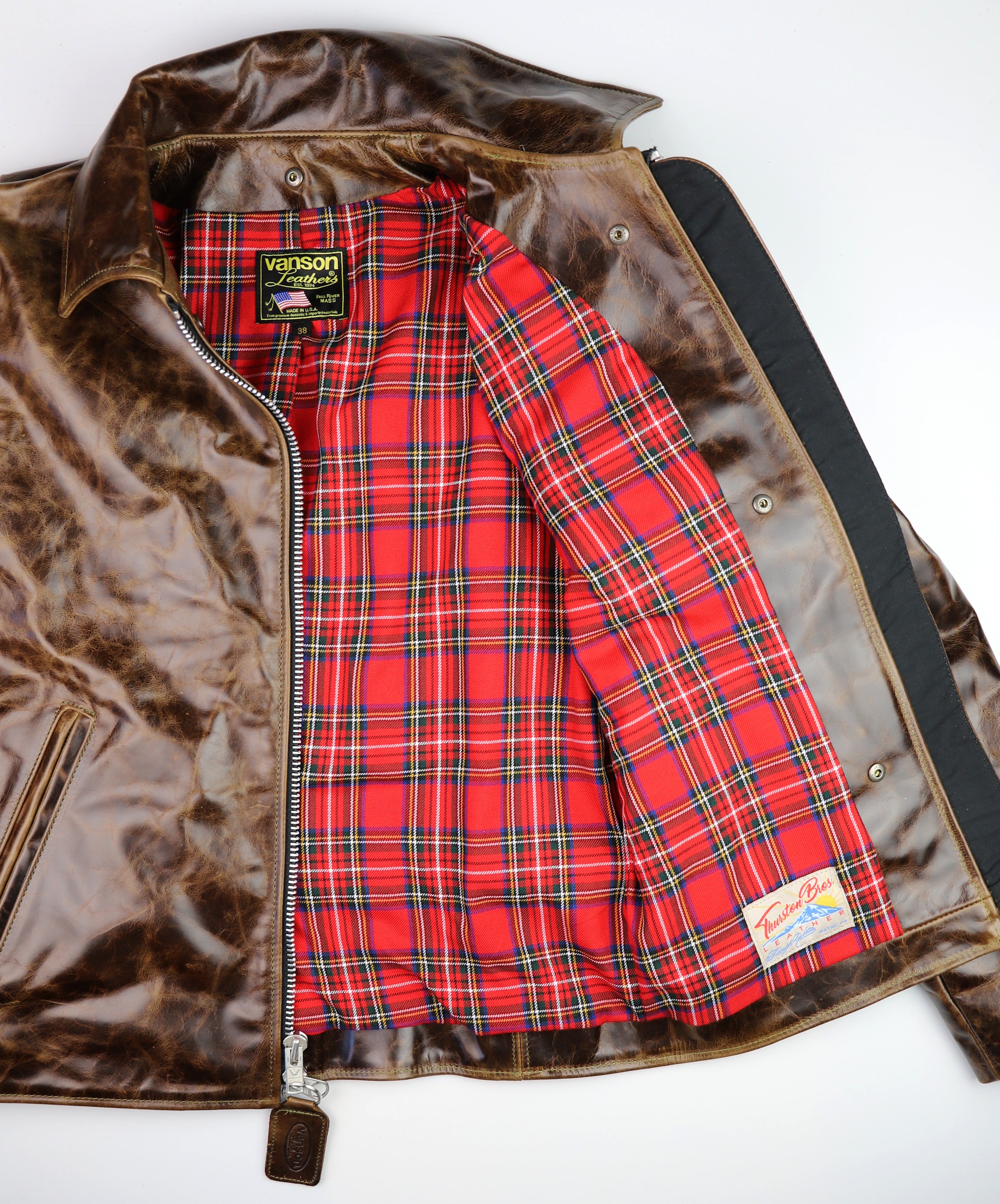 Thurston x Vanson Oxford Jacket!  This Slimfit Oxford is customized for our shop--this jacket is made with Dark Maple Bainbridge cowhide and nickel hardware.  It has a lightweight red plaid rayon lining, shoulder gussets, adjustable side straps, and a right side interior pocket.