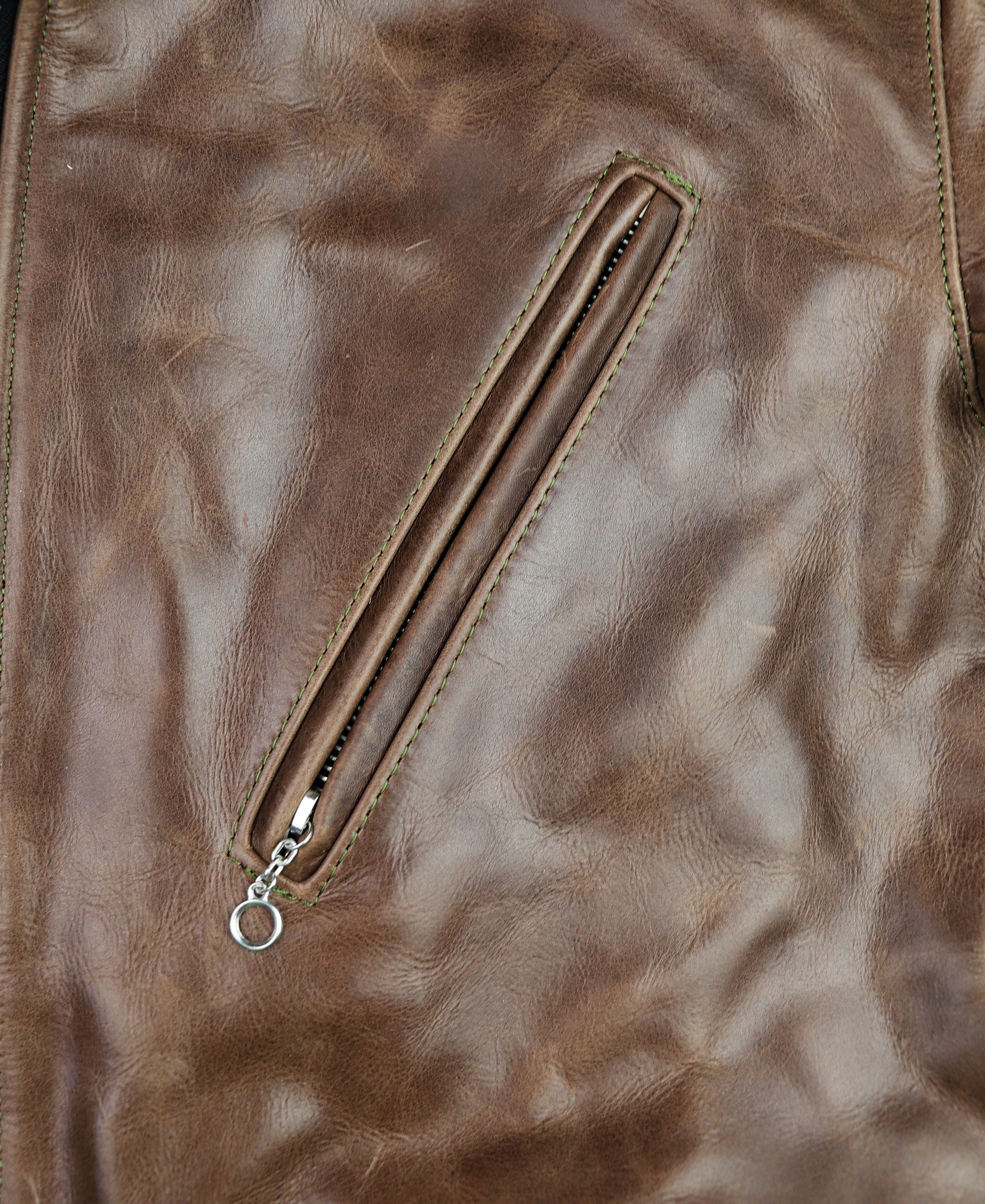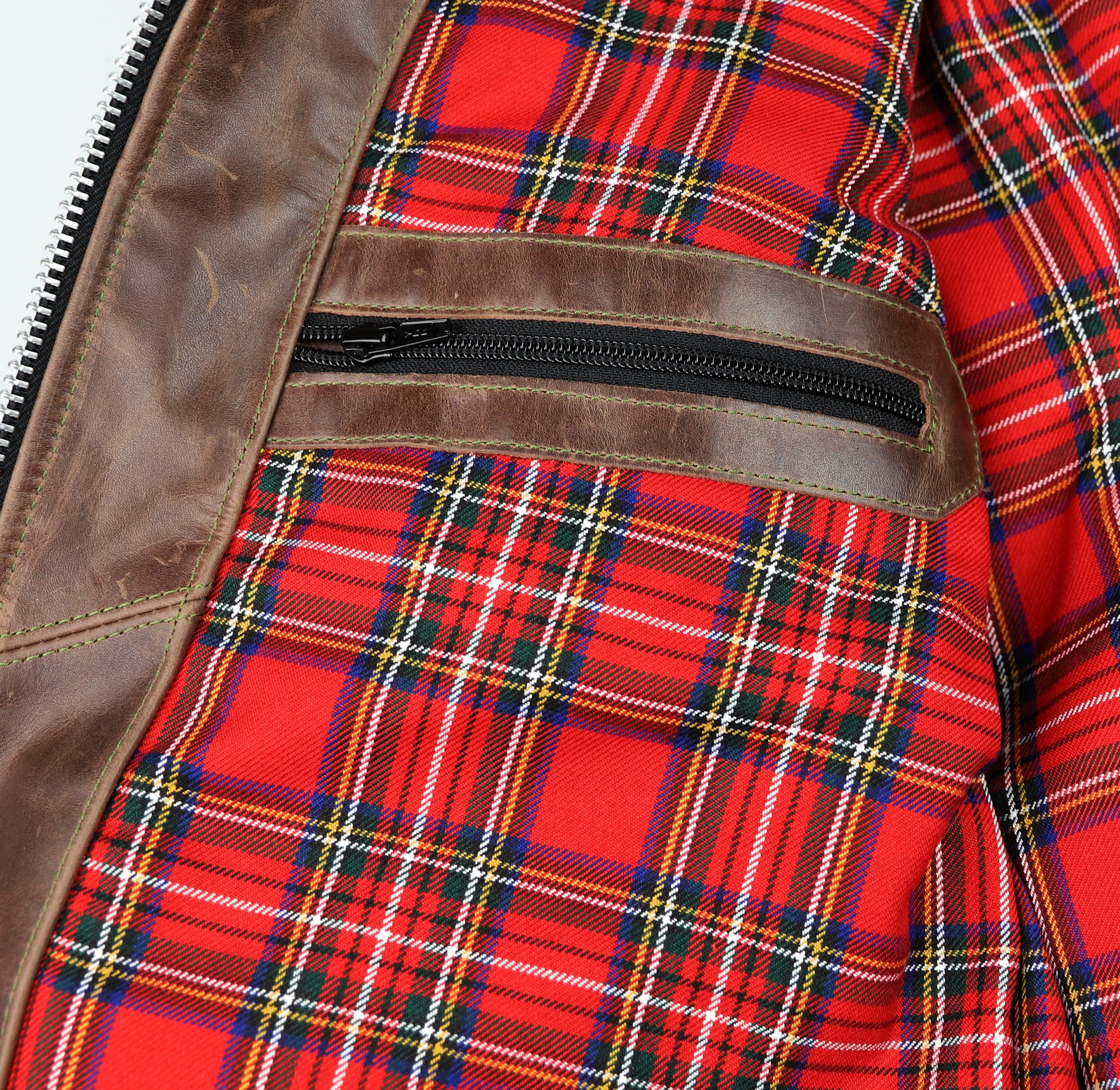 Thurston x Vanson Woodway Half Belt--an incredible Vanson Leather Jacket!  Our Vanson Woodway is customized for our shop--this jacket is made with Brandy Roma Cowhide and nickel hardware with a ring pull on the chest pocket.  It features cargo pockets with handwarmers and cording detail.  Other details are shoulder gussets, straight cuffs and a #10 main zipper.  It has a lightweight red plaid rayon lining, D-ring side adjusters and a right side interior pocket with zipper closure.
