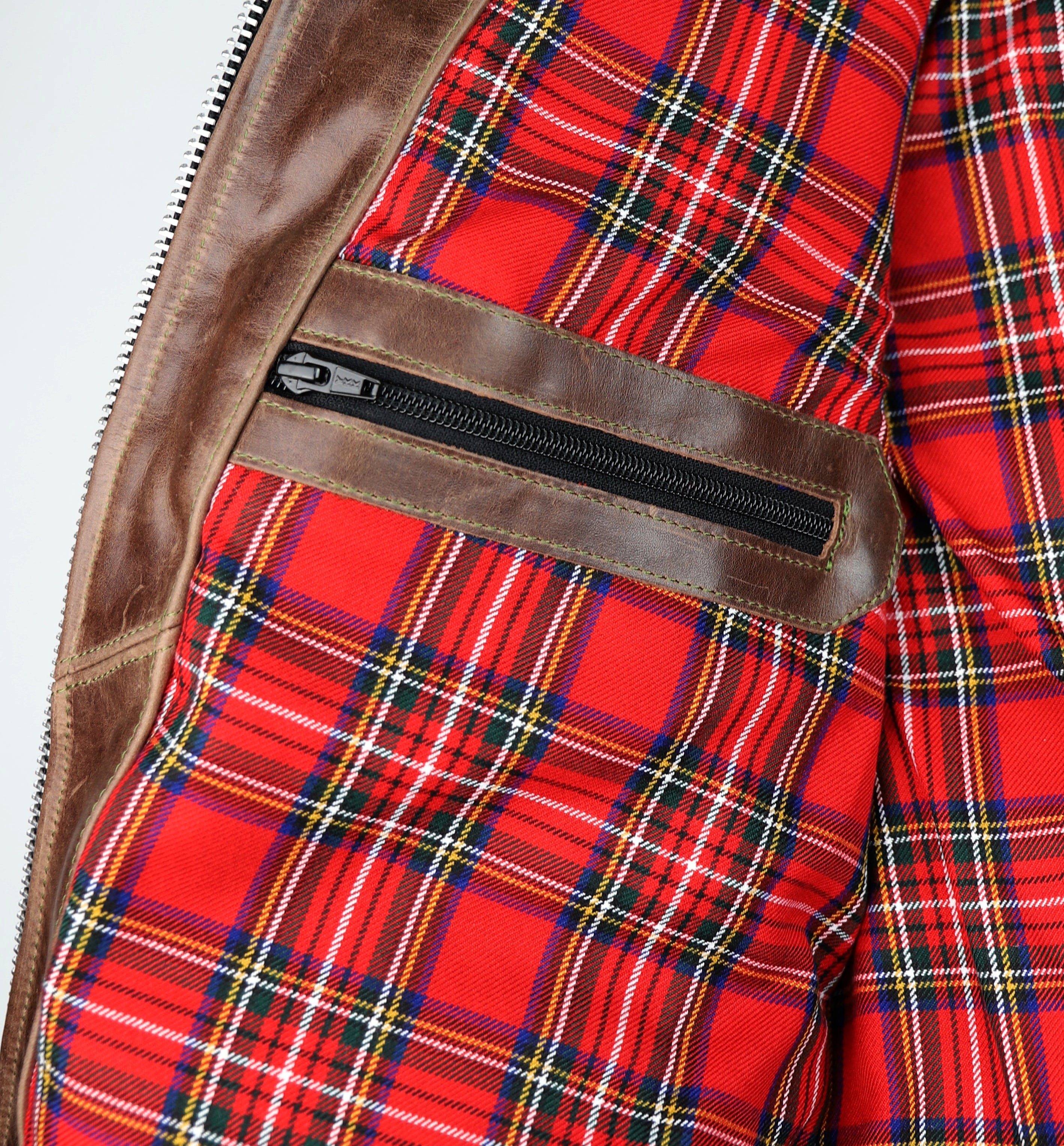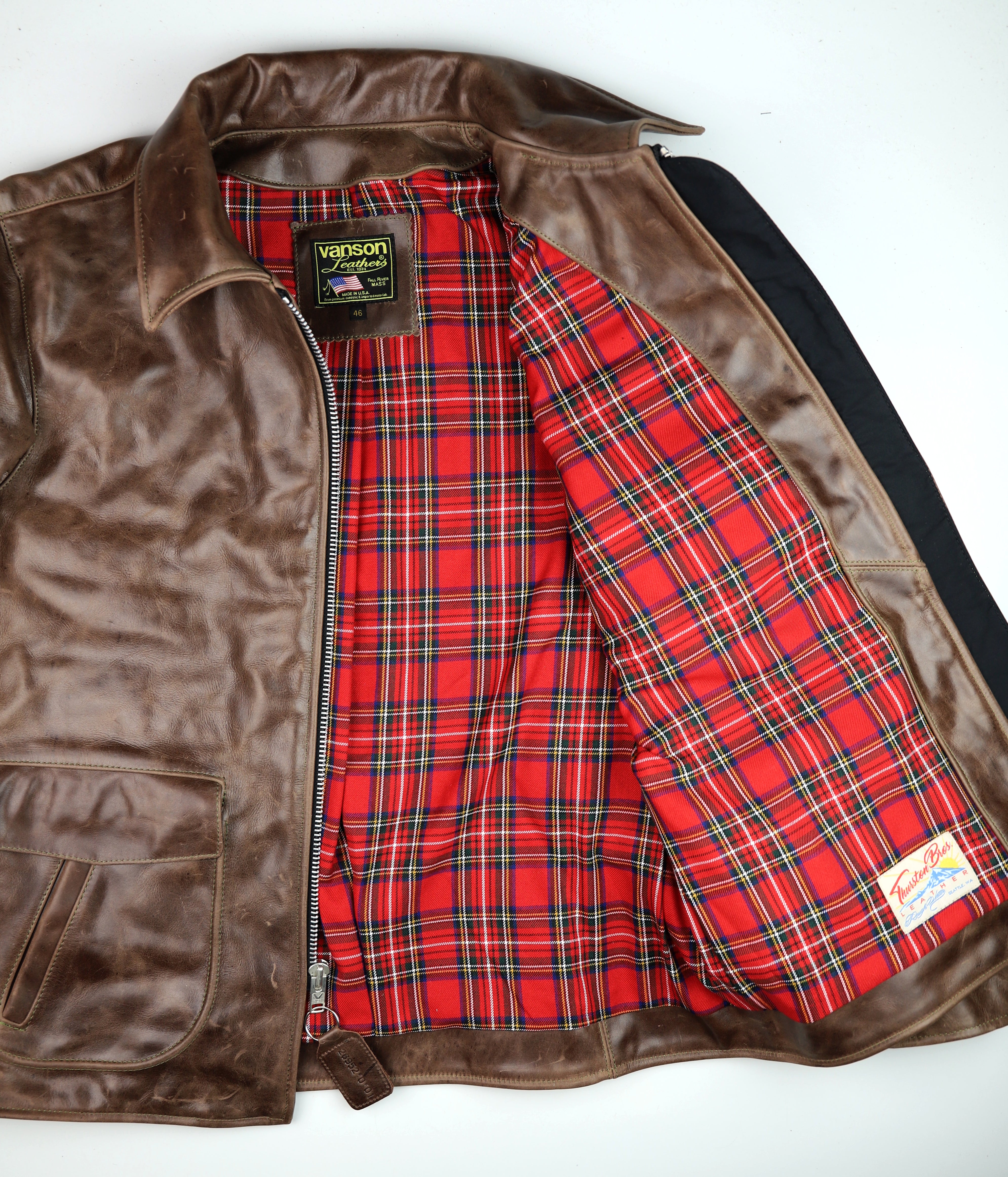 Thurston x Vanson Woodway Half Belt--an incredible Vanson Leather Jacket! Our Vanson Woodway is customized for our shop--this jacket is made with Brandy Roma Cowhide and nickel hardware with a ring pull on the chest pocket. It features cargo pockets with handwarmers and cording detail. Other details are shoulder gussets, straight cuffs and a #10 main zipper. It has a lightweight red plaid rayon lining, D-ring side adjusters and a right side interior pocket with zipper closure.