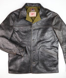 Thedi Hektor Half Belt in Cognac Buffalo. Size 3XL. These jackets are made from a beautiful full grain, veg. tanned Italian leather. The Hektor is reliced to bring out a ton of natural character. This jacket features a button front, handwarmer pockets, double button cuffs, action back, buckle-style side adjusters, contrast stitching and olive cotton lining. Left side zippered interior pocket.