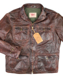 Thedi Memphis Half Belt in Hand Dyed Cocoa Toscano Buffalo. Size 4XL. These jackets are made from a beautiful hand dyed, full grain, veg. tanned Italian leather. The Memphis features a double-ended front zipper, brass Universal hardware, a chest pocket and two handwarmer pockets, strap-style cuffs, half belt back with center pleat, contrast stitching and olive cotton lining. Left side zippered interior pocket.