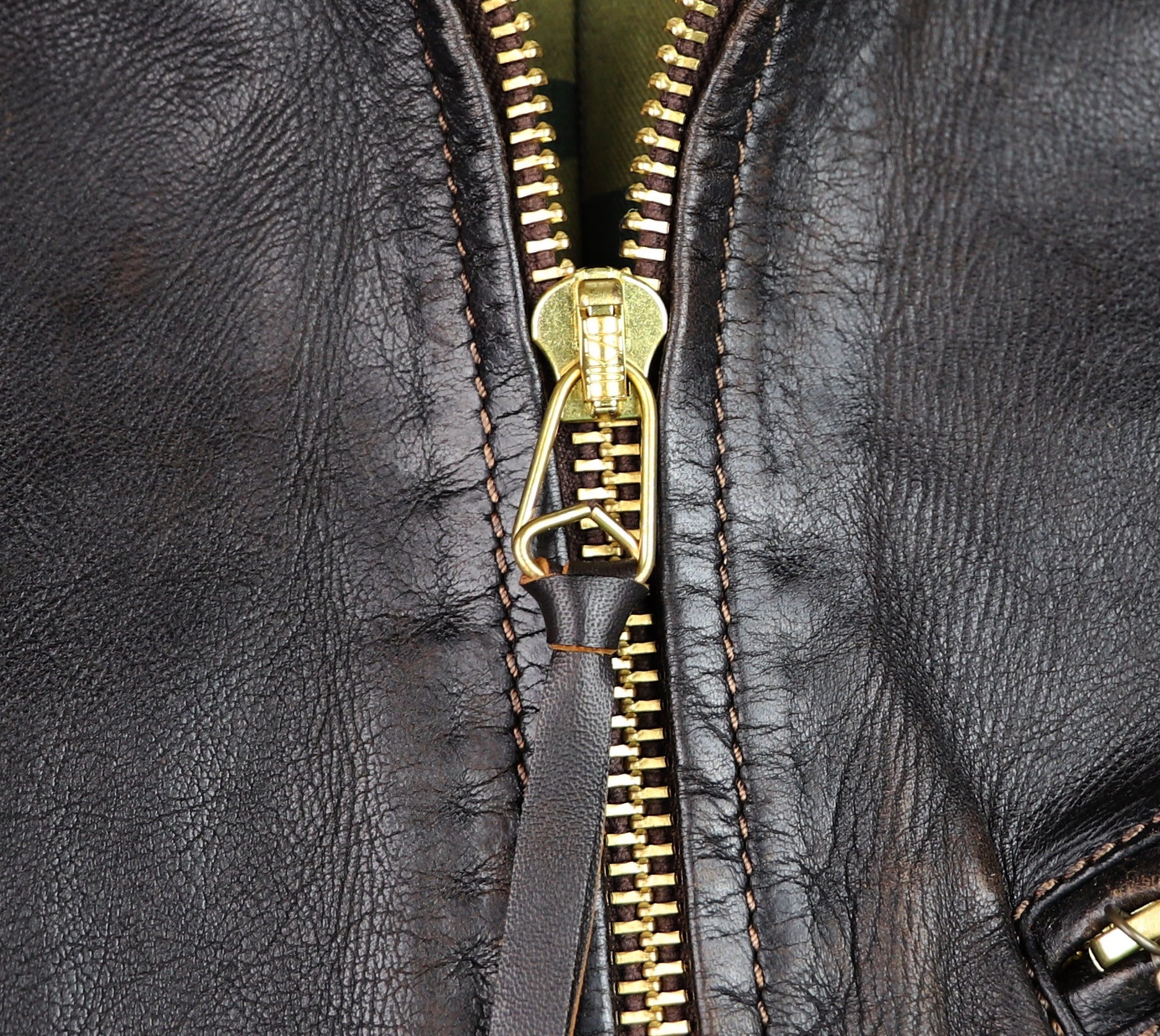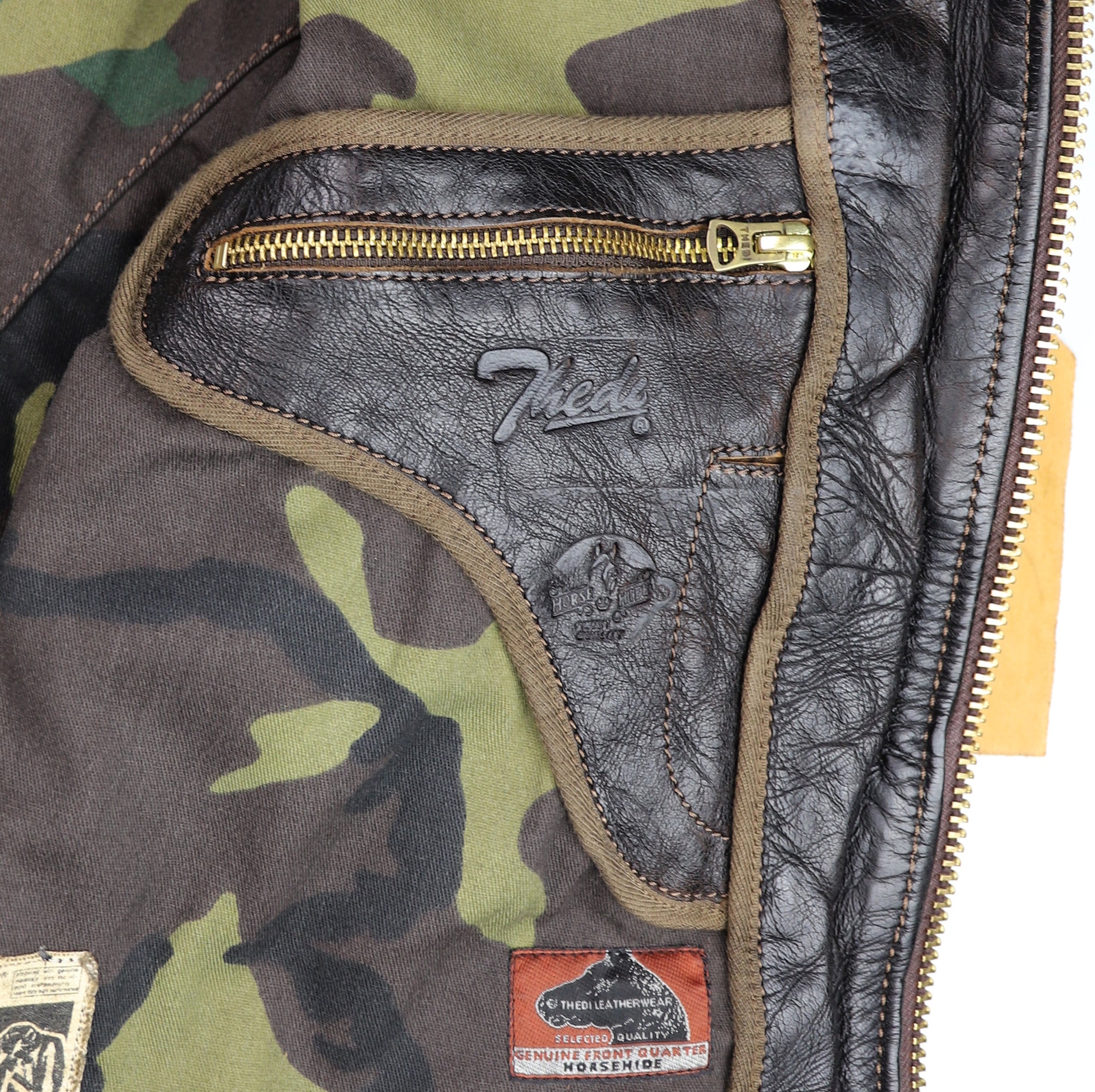 Thedi Memphis Half Belt in Chestnut Bruciato Horsehide. Size Large. These jackets are made from a beautiful hand dyed, full grain, veg. tanned Italian leather. The Memphis features a double-ended front zipper, brass Universal hardware, a chest pocket and two handwarmer pockets, strap-style cuffs, half belt back with center pleat, contrast stitching and cotton camo lining. Left side zippered interior pocket.