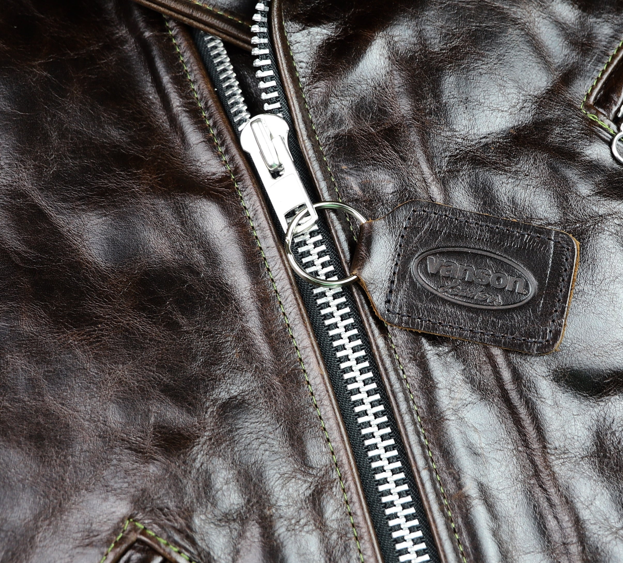 Vanson Daredevil--an incredible Vanson Leather Jacket!  This custom slimfit style is made with Dark Hickory Vancouver, nickel hardware, camo cotton lining, shoulder gussets, three-pocket front, bicep zipper, double-ended front zipper, right side horizontal interior pocket and left side vertical interior pocket.