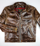 Thurston x Vanson Oxford Jacket! This Slimfit Oxford is customized for our shop--this jacket is made with Dark Maple Bainbridge cowhide and nickel hardware. It has a lightweight red plaid rayon lining, shoulder gussets, adjustable side straps, and a right side interior pocket.