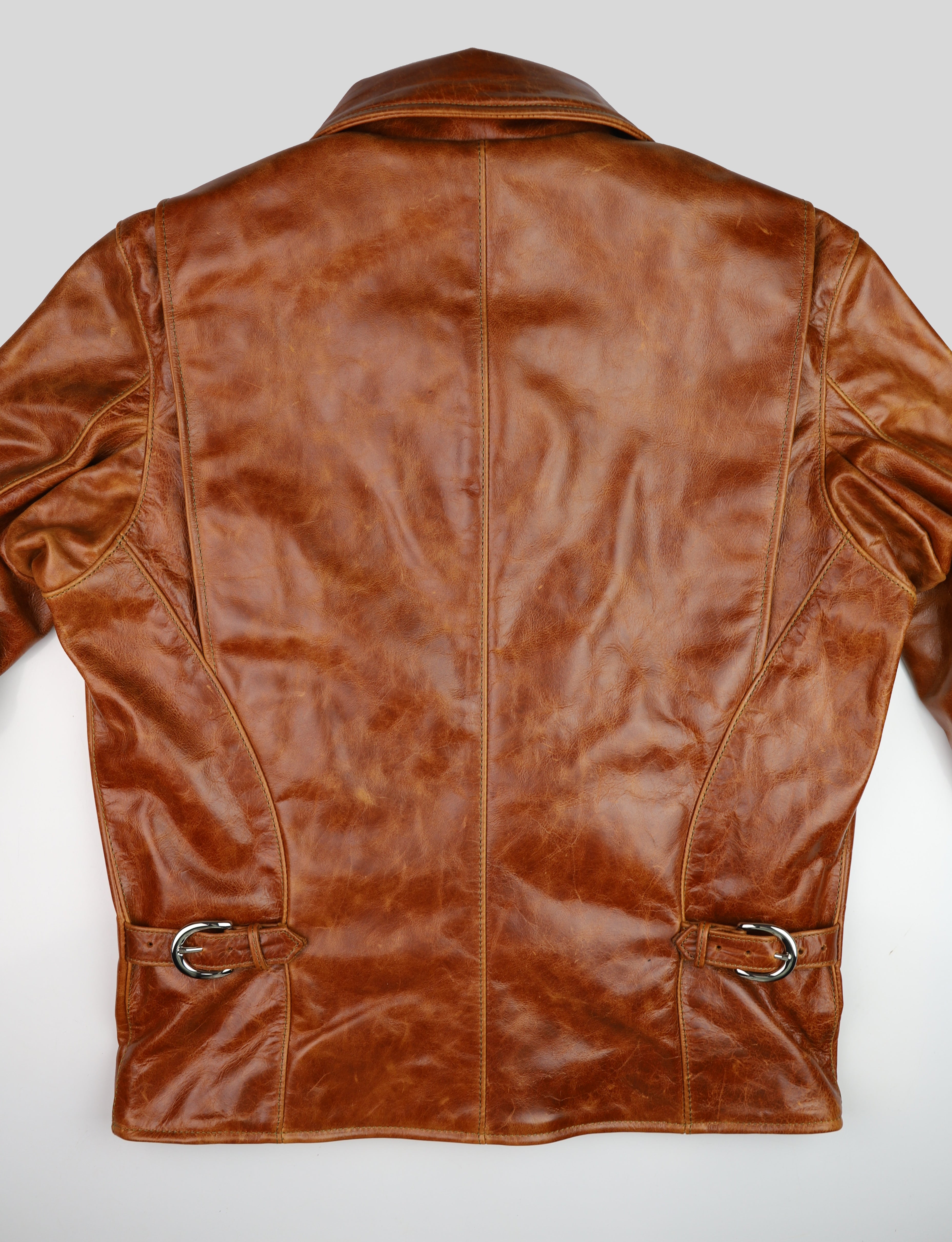 Our Bainbridge leather is a full grain bovine hide sourced from an Old World tannery with over a century and a half of heritage. This leather is chrome-tanned with a dramatic pull-up effect and develops a fantastic classic patina. Thickness is approximately 1.2 mm. We’ve hand-selected this leather for its transformational qualities and vintage appeal. This leather starts off smooth and firm, yet develops full grain character and a supple feel within a few hours of wear. Our Bainbridge displays all the characteristics of full grain Old World leather at a modern pace. Bainbridge is available from Thurston Bros. for off-the-rack and custom jackets.