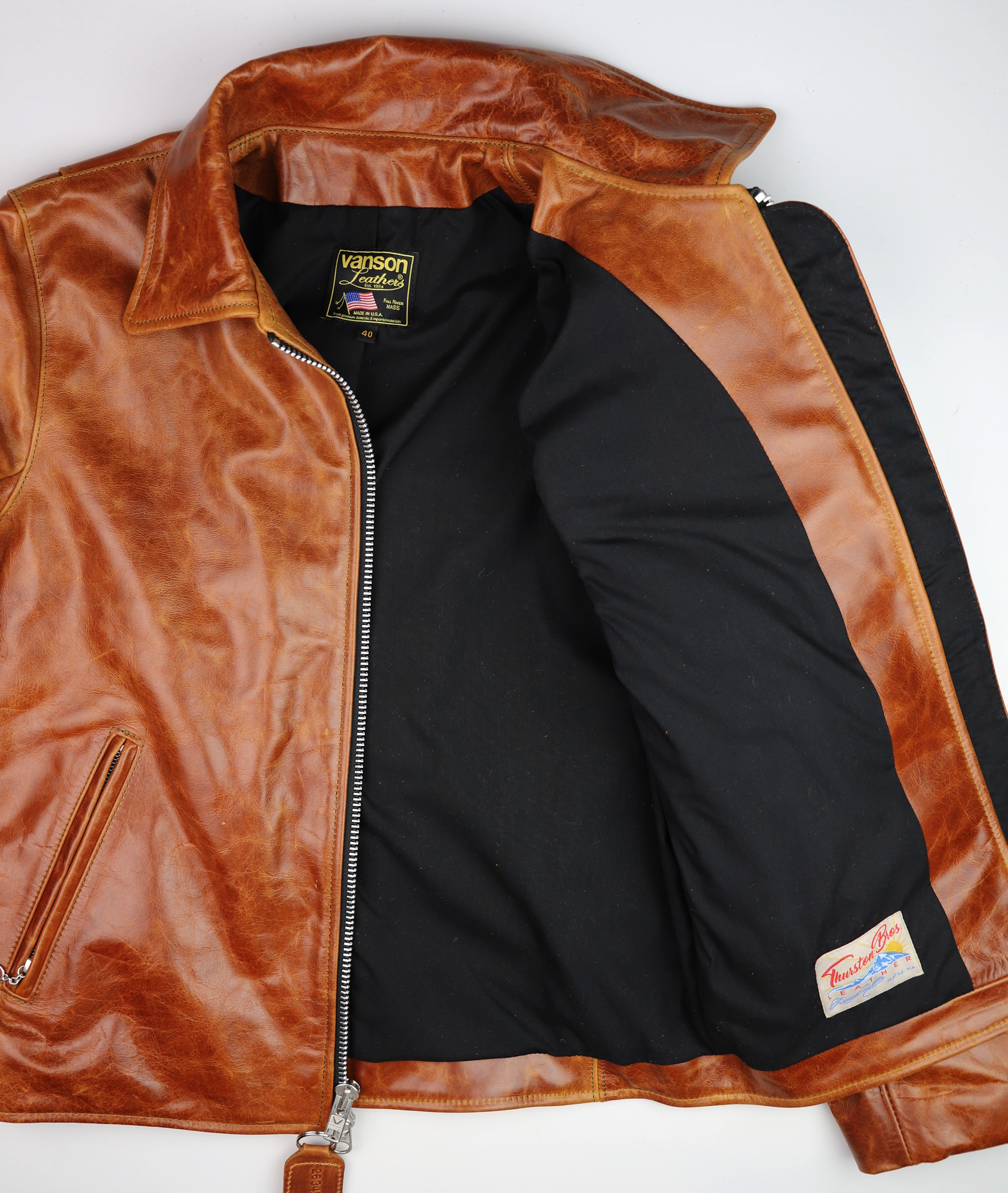 Thurston x Vanson Oxford Jacket! Our Oxford is customized for our shop--this jacket is made with Cedar Bainbridge cowhide and nickel hardware. It has a lightweight black rayon lining, shoulder gussets, adjustable side straps, and a right side interior pocket. This jacket is is slightly more tapered through the waist compared to a standard Oxford fit.