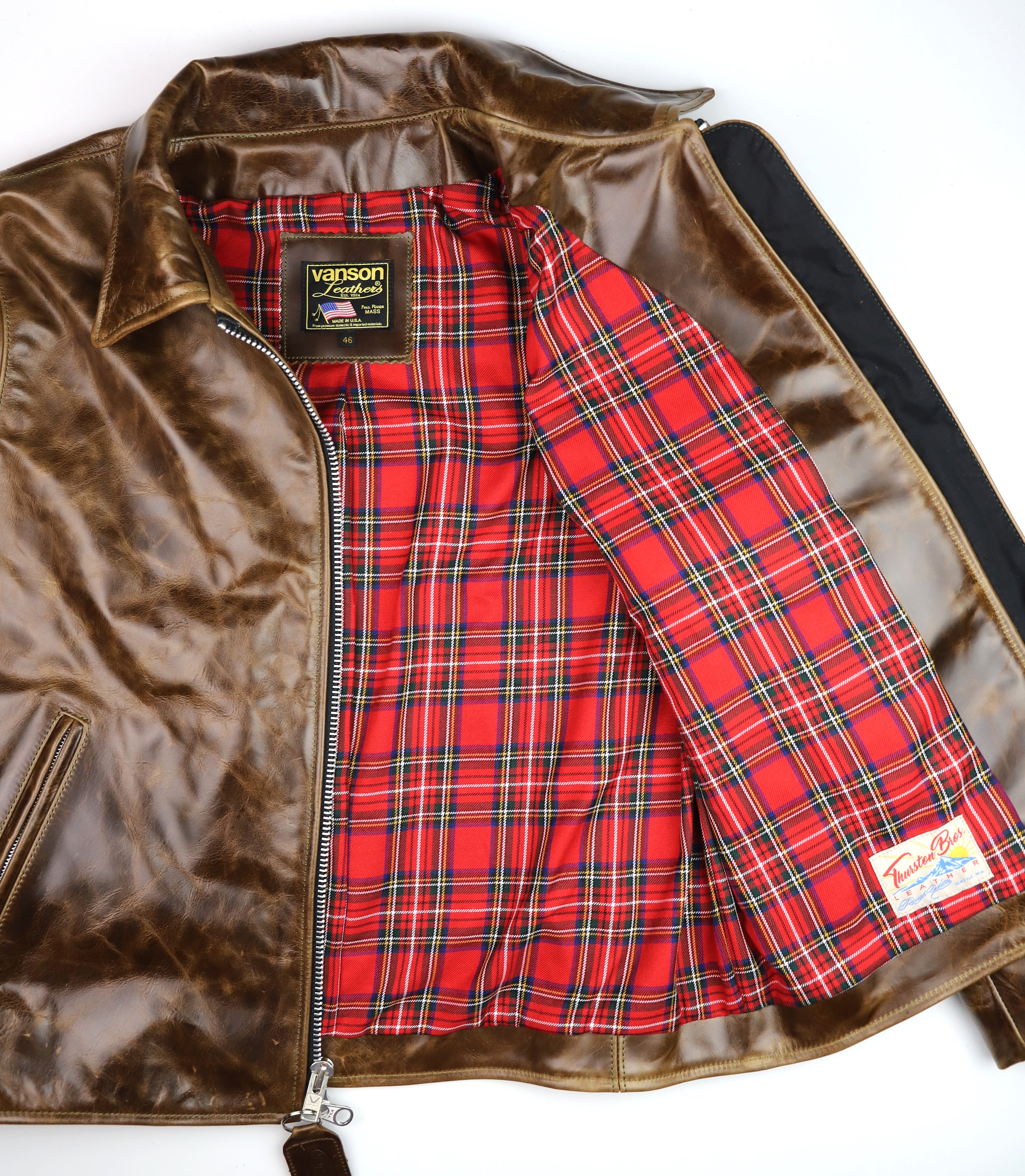 Thurston x Vanson Oxford Jacket! This Slimfit Oxford is customized for our shop--this jacket is made with Dark Maple Bainbridge cowhide and nickel hardware. It has a lightweight red plaid rayon lining, shoulder gussets, adjustable side straps, and a right side interior pocket. This jacket is is slightly more tapered through the waist compared to a standard Oxford fit.
